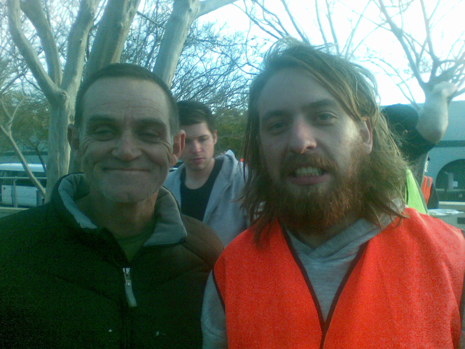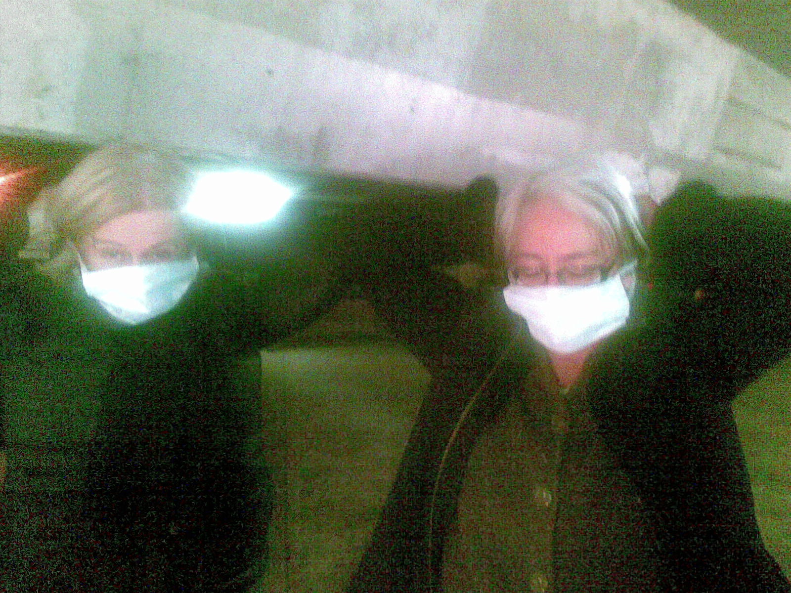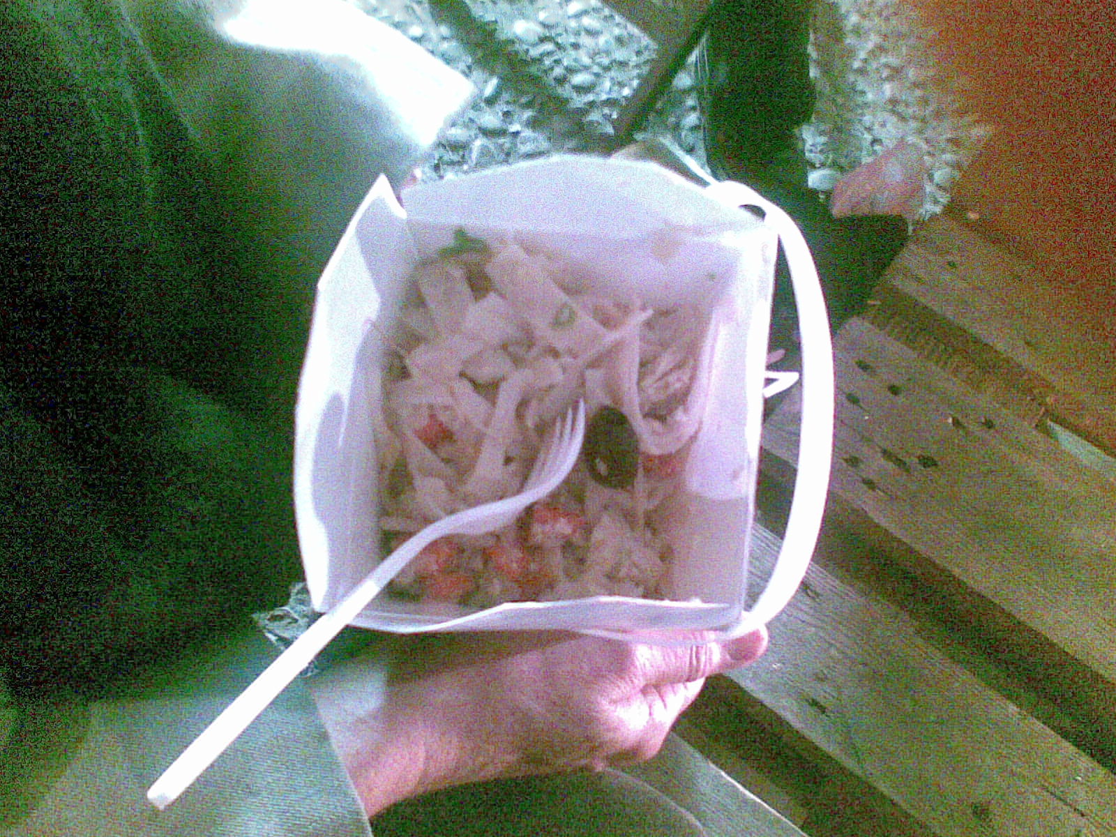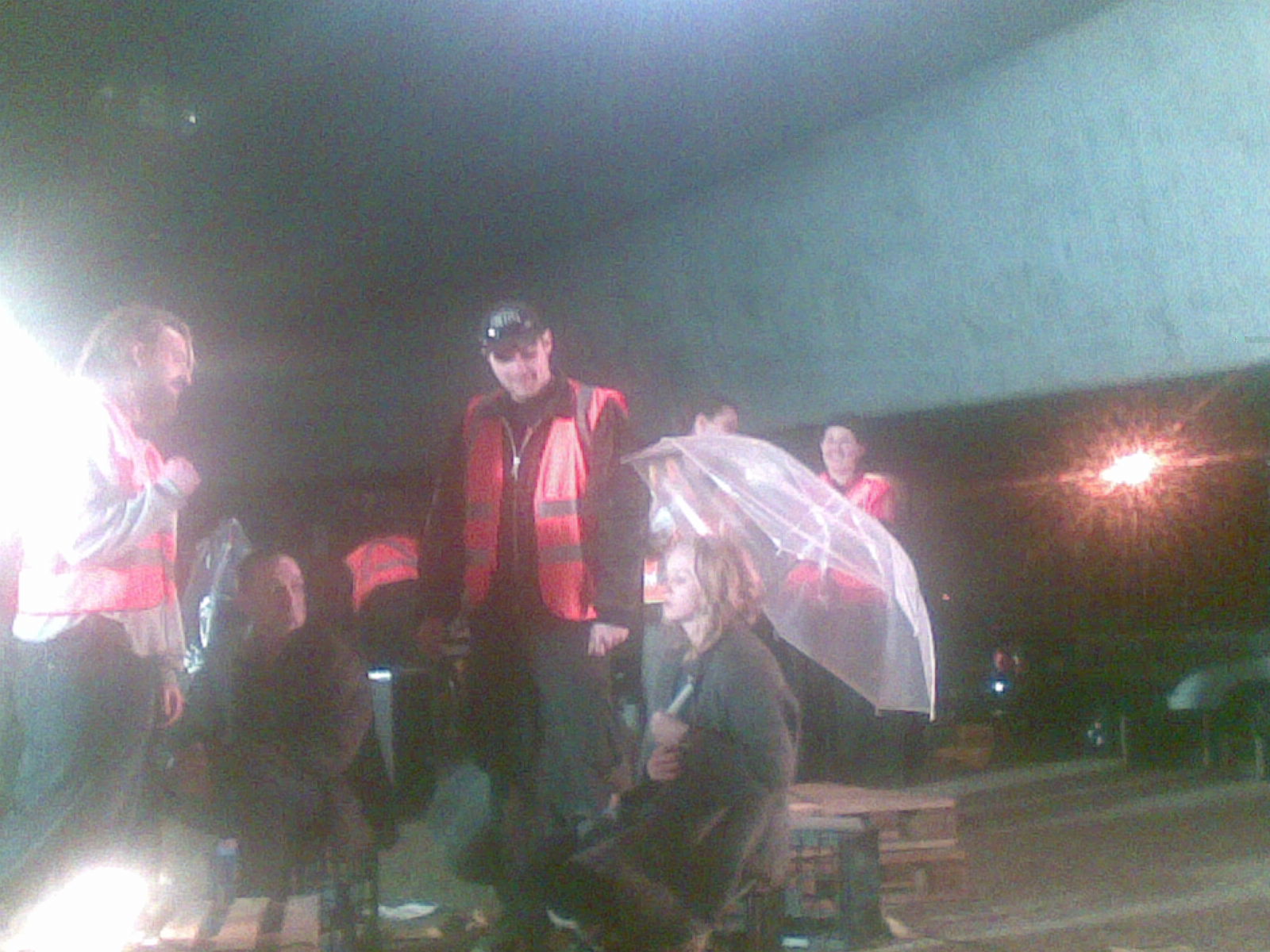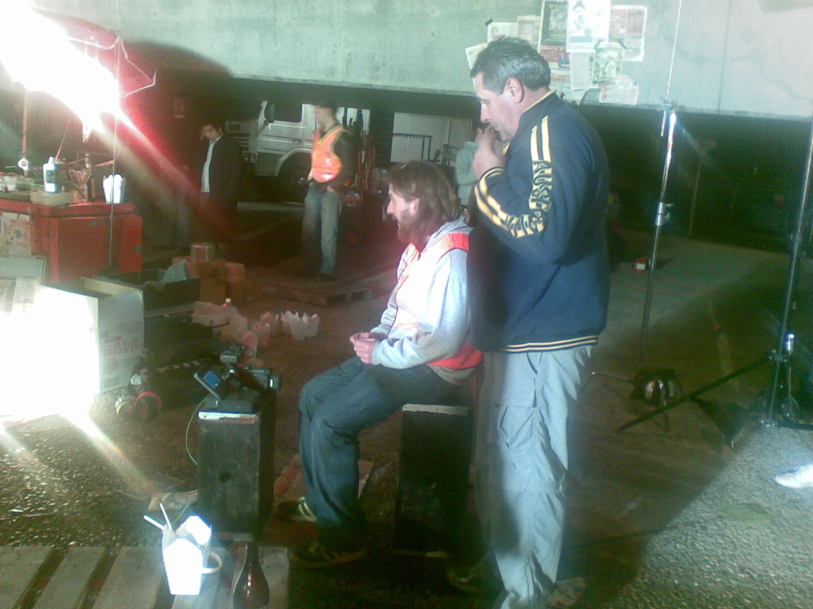 I’m getting up scarily early tomorrow to catch a plane, but I couldn’t go to bed without a quick note about this evening. Penny and I and quite a few other people were extras in the film Alex is making as part of his year-long director’s course at AFTRS. That’s the Australian Film Television and Radio School. We spent hours standing around being bored, and minutes sitting in front of the camera – at least I was sitting, pretending to eat disgusting noodles, while Penny had a more upright role, wearing an anti-infection mask. I loved seeing – and being a small part of – the well-oiled machinery of a film shoot in action, and I especially loved seeing the way the two actors, in the midst of so much noise and busyness, managed to make something happen between them. All this happened beneath the roar of the Expressway in Pyrmont, close to the city. I took a number of blurry photos with my phone camera. No time for more – here is Alex with actor Richard Green (of Boxing Day fame), a masked Penny, Alex in a variety of directorial moments (including one with Anna Lise Phillips with an umbrella – did I mention it rained a fair bit? Anna Lise lent me her hoodie), and the disgusting noodles.