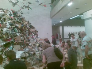 Really I only saw three pieces. The first was ‘In Flight‘ by Alfredo and Isabel Aqulizan. The artists are immigrants to Australia from the Philippines, this information may have influenced my response to their work: it’s a huge pile of recycling material, that is to say junk, reminiscent of those vast garbage heaps near Manila, but rising from it are not toxic fumes or scavenging birds but a host of model aeroplanes made by young people in a series of workshops before the exhibition. The planes – zappy little plastic creations, shaggy monsters, a couple of balloons, flappable egg-cartons, brightly coloured paddlepop sticks bound into shapes that might be aerodynamic in another universe – adorn the wall near the garbage pile, hang from the ceiling  above it, and then lead the viewer down the nearby corridor to the exit that leads to the main exhibition in the Goma building. Around the base of the pile the creativity continues, as my phone bears witness: