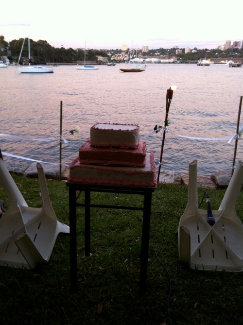 It was a wonderful event. The ceremony was in the relatively new Ballast Point Park, formerly – as the name suggests – a source of stone for use as ballast, and until recently a site dominated by oil storage tanks. Now parts of the largest tank have been used as a sculpture, an iron crown floating over the park, with a line of Les Murray’s poetry punched into the rusting iron. The park itself is pretty stark so far, dominated by a bare sandstone cliff, but indigenous plants have been planted there and promise that in time it will be a softer, kinder place. It provided us with a fabulous site for a wedding: a grassy lawn enclosed by rock, hacked into circular shape, presumably to accommodate an oil tank. (The only photo at this link shows the exact spot, though you’ll have to imagine the flowered arch and hundred people.)