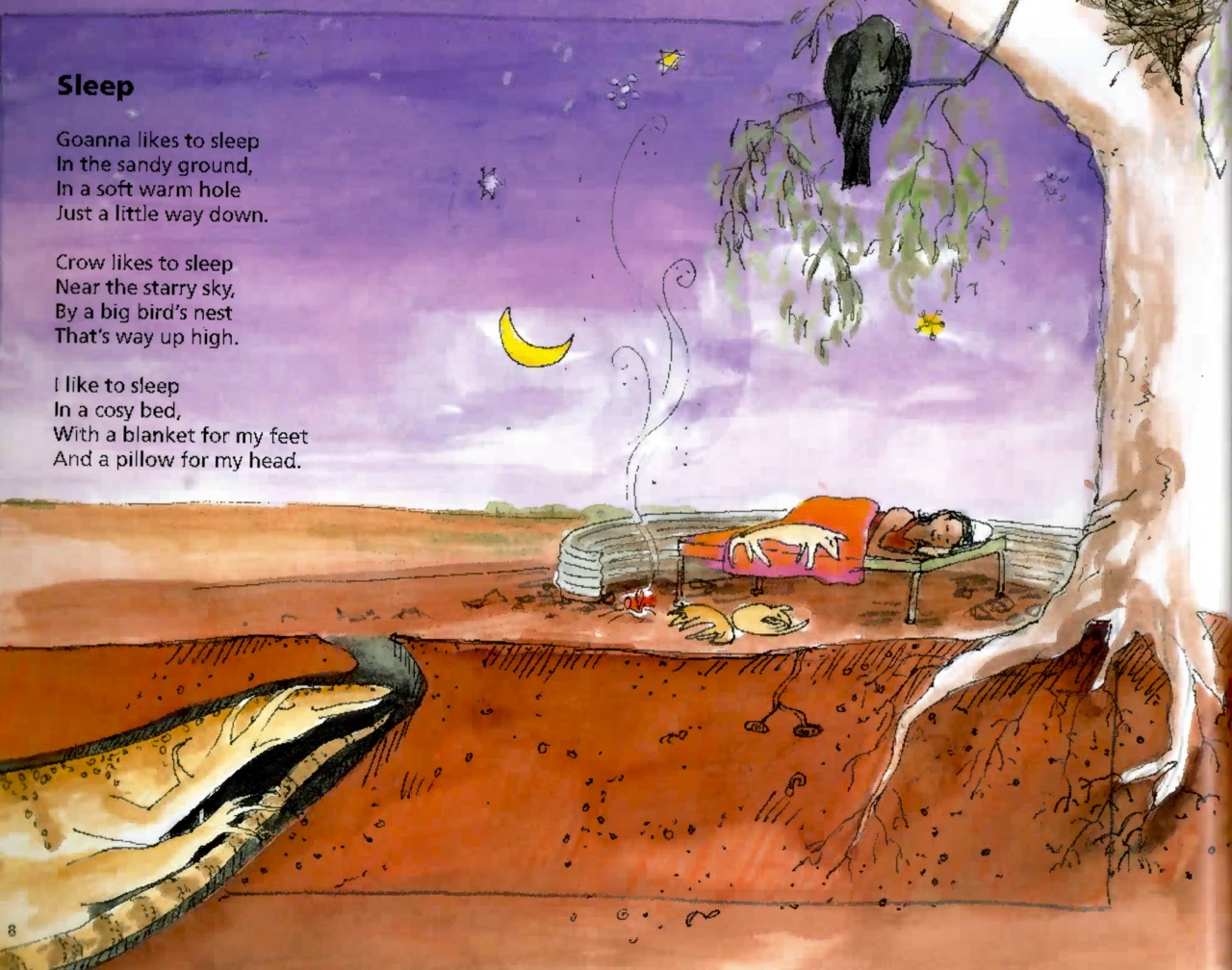 Jenny Taylor’s illustrations demonstrate just how important the interplay of text and image can be in a picture book. One page that struck me in particular was ‘Sleep’. The poem: