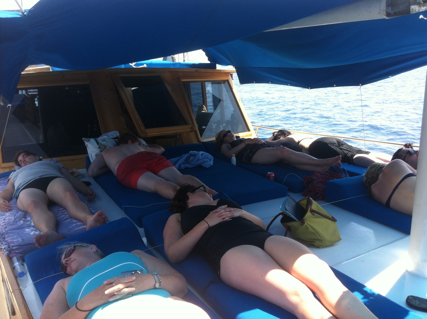 We dropped anchor and swam. We set off again. We lazed around on our day beds. If we used every available space there was just room for the twelve of us, plus the captain and single crew member–cook, to lie down above deck.