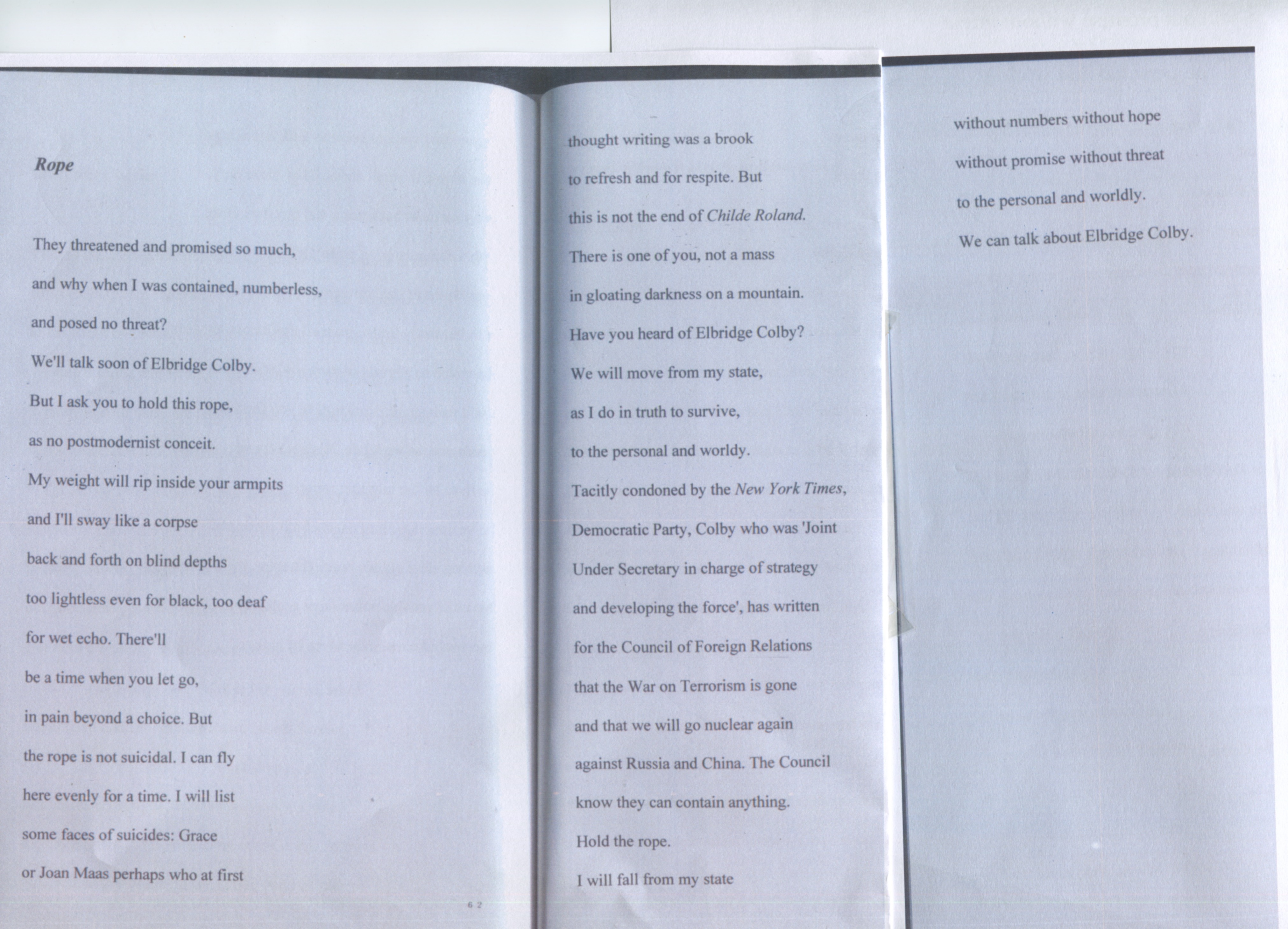 The poem is in three parts. The first four lines set the tone: the speaker, who sees herself as harmless, has been threatened and promised much by a nameless ‘they’ – the fourth line seems to suggest that soon, with talk of Elbridge Colby, some of this will become clearer. The next eighteen lines deal with the speaker’s distressed ‘state’, the poem a rope that prevents her from plummeting into ‘blind depths / too lightless even for black’. After a four-line transition (‘We will move from my state’), there are nine lines about Elbridge Colby, which raise the spectre of nuclear war, and I guess we understand why she is so upset, and who the opening ‘they’ are. The final six lines come close to an expression of despair, though I read the final line, ‘We can talk about Elbridge Colby’, as an assertion of the power of poetry, in the spirit of T S Eliot’s ‘These fragments I have shored against my ruin.’