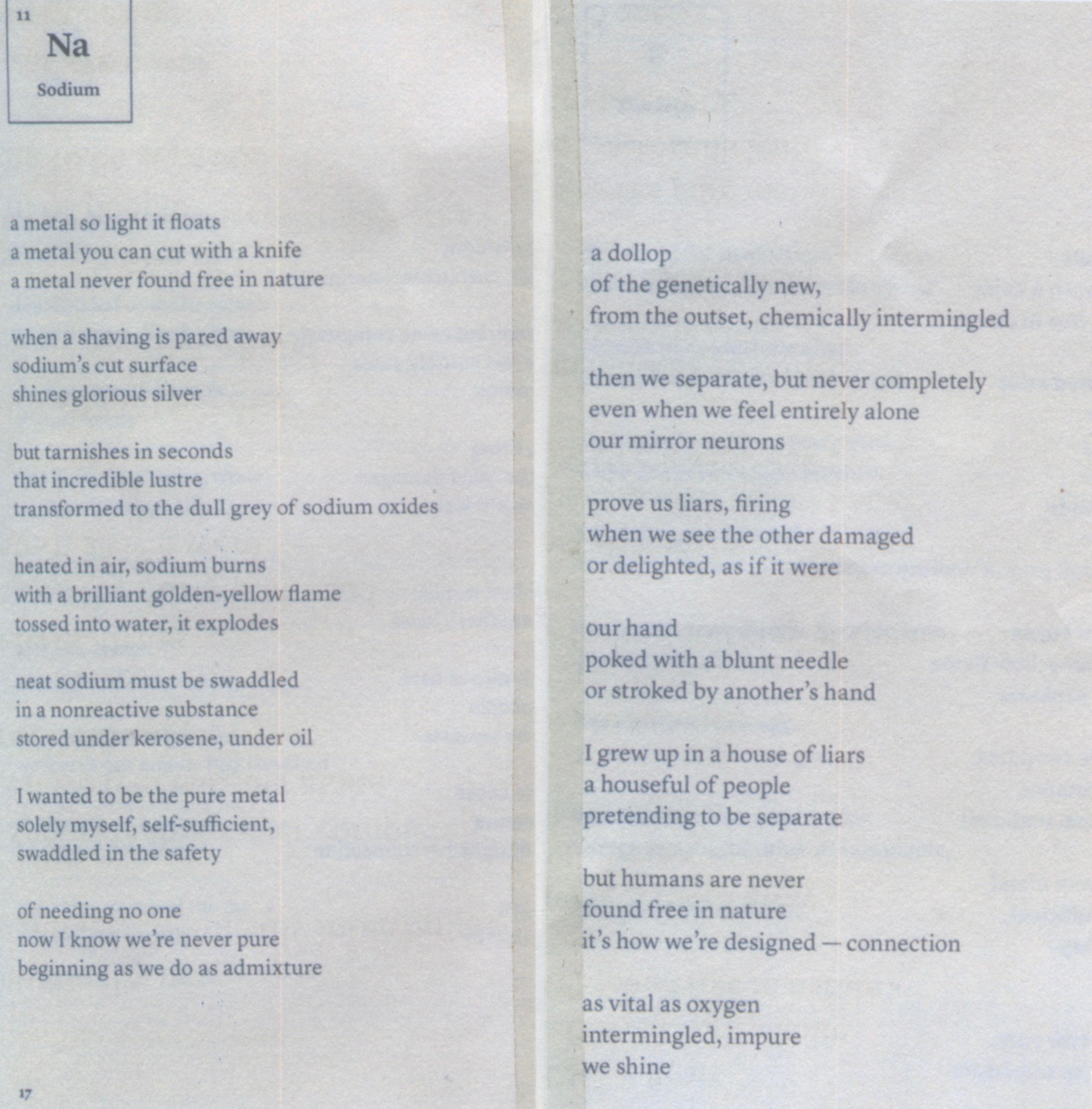 Currently when I blog about a book of poetry, I try to write about just one poem in some detail. Here it has to be one from the title sequence. I’m drawn to ‘Manganese’, a fabulously multifaceted look at tea. But ‘Sodium’ has got my favourite line in the book. Here it is (you can click on the image to see it large):