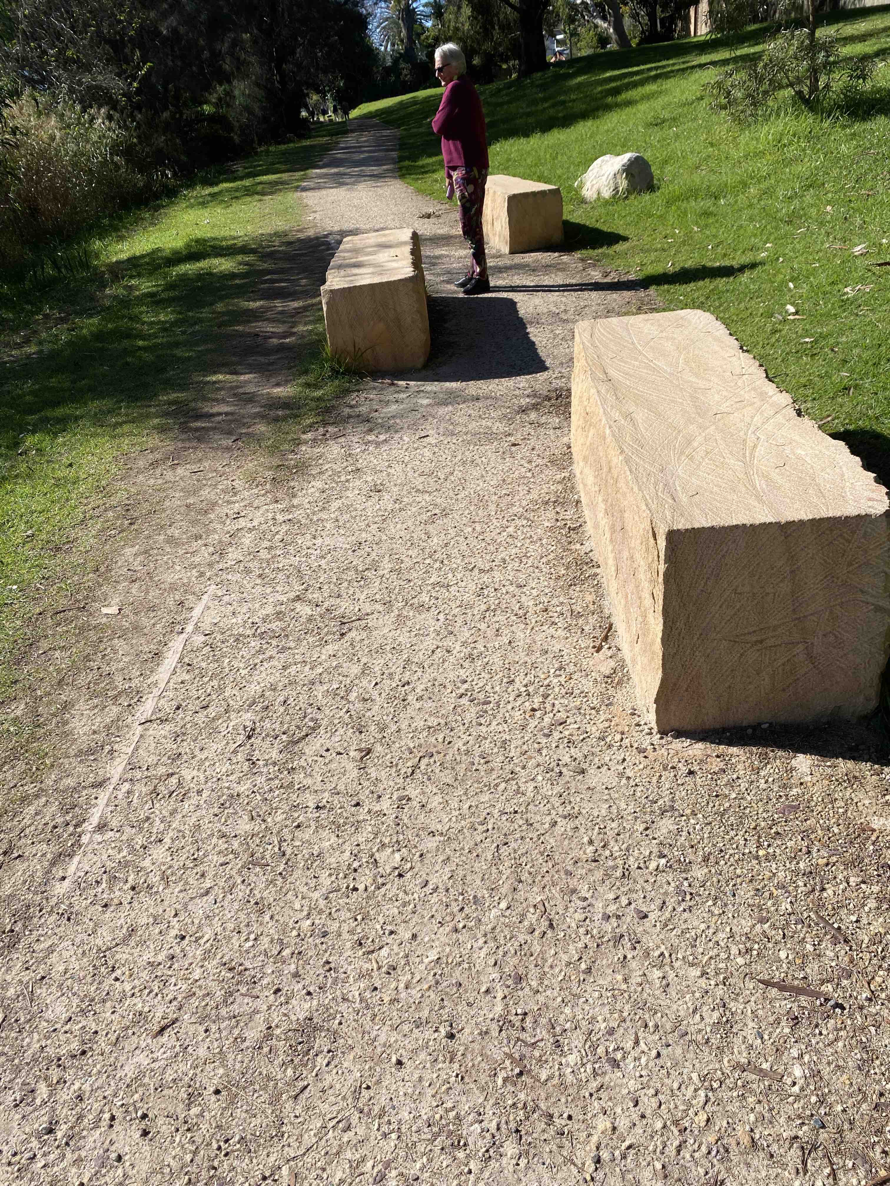 Saturday in the Inner West (Dulwich Hill, Earlwood, Marrickville, Enmore) I kept noticing other drivers being courteous and generous, often with a friendly smile, which was pretty good given how heavy the traffic was. I’m not counting them, but we had a similarly courteous encounter while walking on the Earlwood side of the Cooks River. As we approached a little sandstone-block chicane (see photo) designed to make the path unpleasant for bike-riders, a 60-something man with earbuds approached from the other direction, jogging at an impressive pace. We stopped to let him through, but he also stopped, and waited until I gave an explicit ‘After you’, then ran between the stones and past me with a friendly smile.