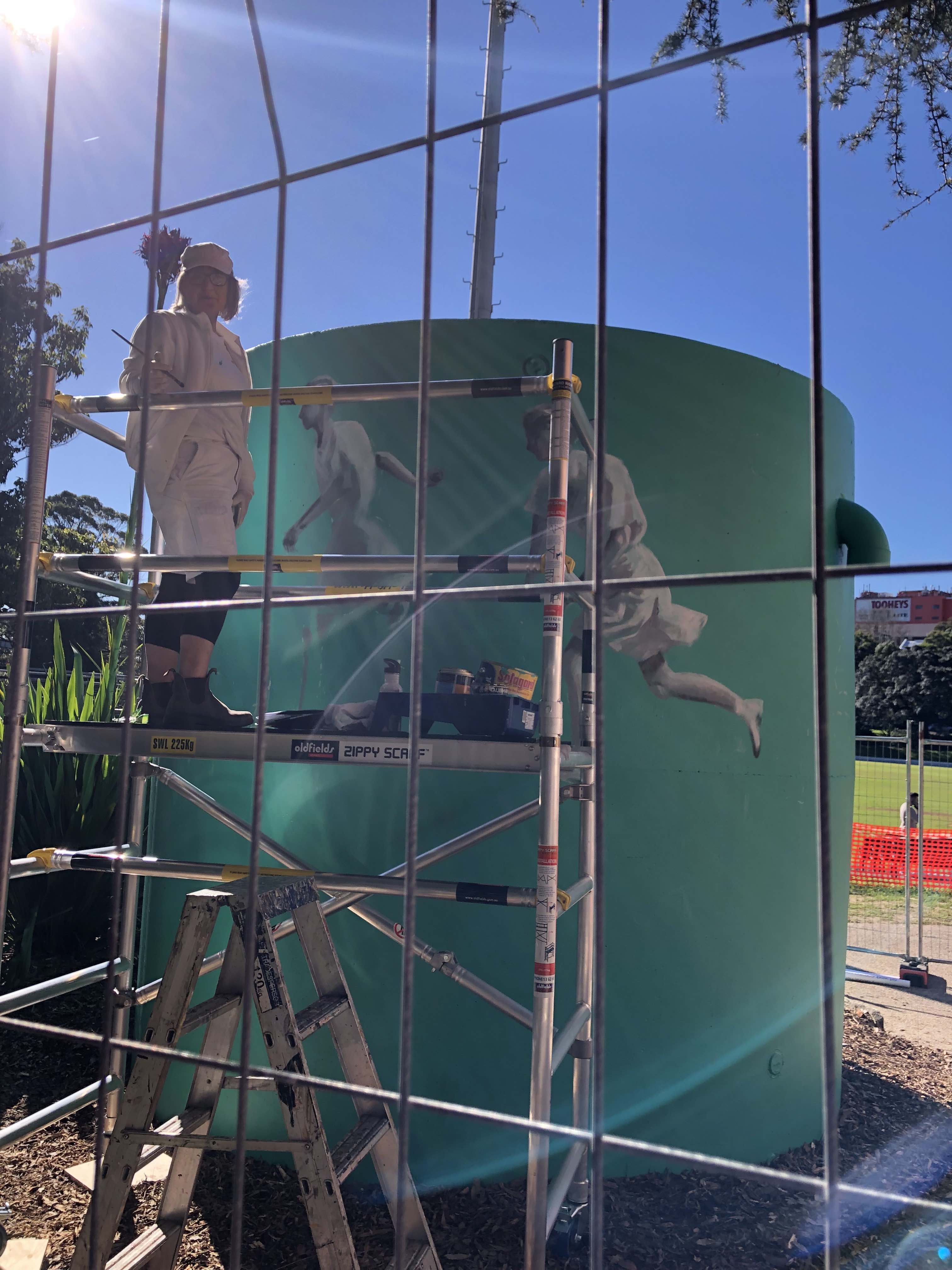 Thursday midday, the Emerging Artist, granddaughter and I visited Kelly Wallwerk, an artist-friend of the EA who is painting a mural on a water tank beside the oval in Petersham Park. The mural will show a woman in whites bowling, and we had a long chat about the process of creating it. (Photo in the slide show below.)