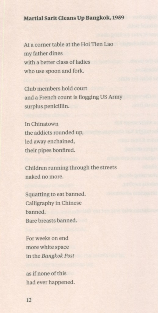 What makes the poem hit home for me is the personal resonance in the last lines. It’s not just that the ‘clean-up’ events were invisible the English-speakers in Bangkok back then. They have been invisible in the received version of the poet’s family story. The poem results from a probing of that story. The apparent neatness of the conclusion actually poses a question: what to do with the knowledge that one’s parent/forebear was on the wrong side of history, or at best an oblivious bystander?