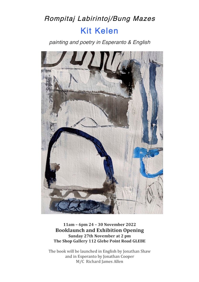 If you’re in Sydney this coming Sunday – 27 November – you might like to drop in on this exhibition opening and book launch at the Shop Gallery in Glebe at 2 pm. The book is Rompitaj Labirintoj / Bung Mazes, poems in English and Esperanto by Kit Kelen (about whom I have blogged a couple of times).