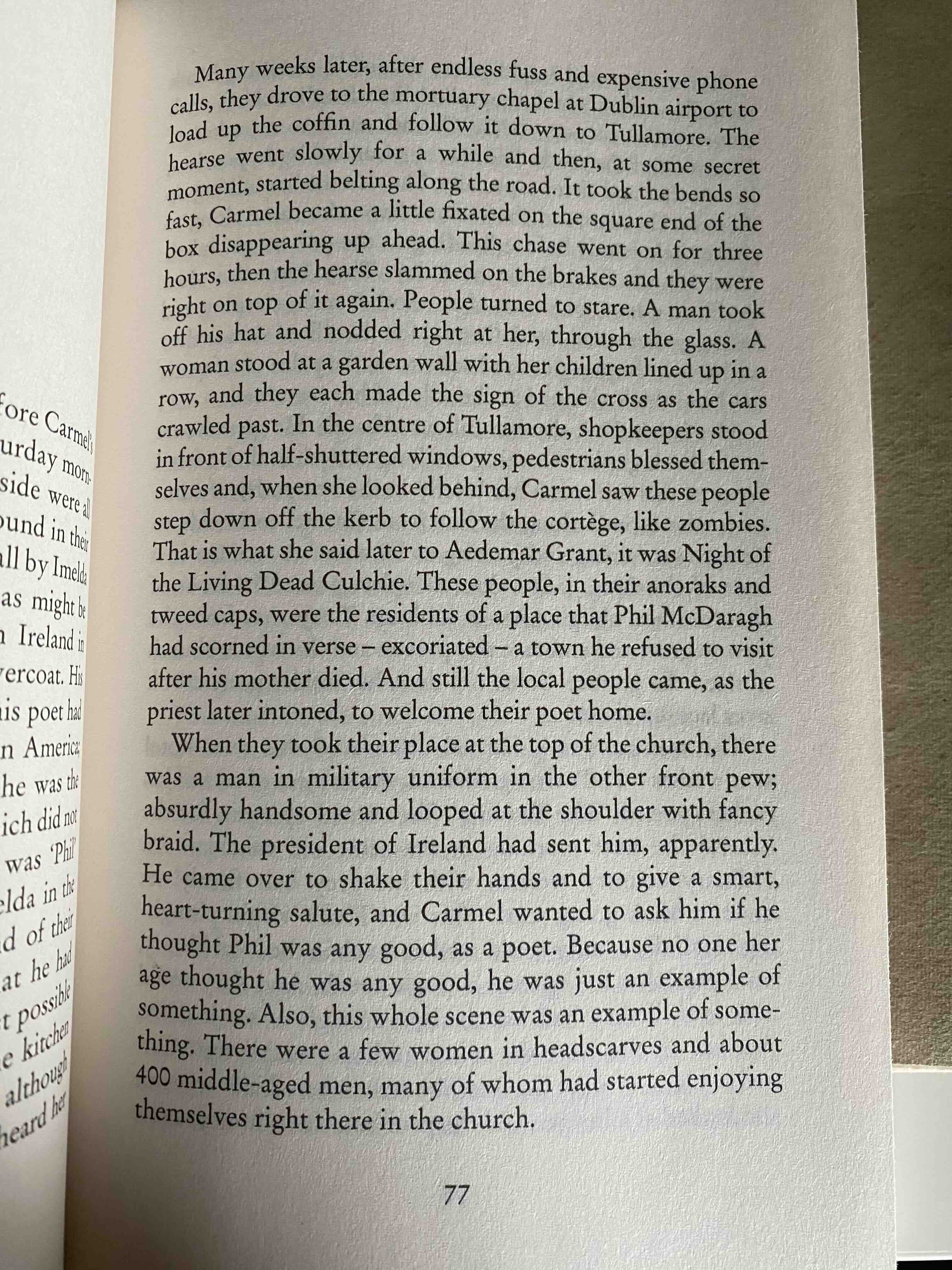 People turned to stare. A man took off his hat and nodded right at her, through the glass. A woman stood at a garden wall with her children lined up in a row, and they each made the sign of the cross as the cars crawled past. In the centre of Tullamore, shopkeepers stood in front of half-shuttered windows, pedestrians blessed themselves and, when she looked behind, Carmel saw these people step down off the kerb to follow the cortège, like zombies.