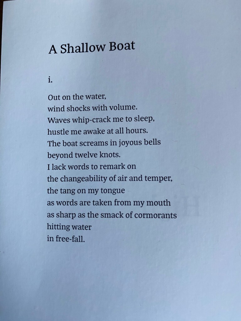 The poem is almost a sonnet. The first six lines describe the wind, the waves, the sounds of the boat. Then there’s a turn, and in the next five lines the poet tries and fails to articulate a response. Then there’s a three-line equivalent to a sonnet’s final couplet – rather than a witty encapsulation of what has gone before, here it’s the cormorants, ostensibly a metaphor for the poet’s speechlessness but actually just there, smacking the water.