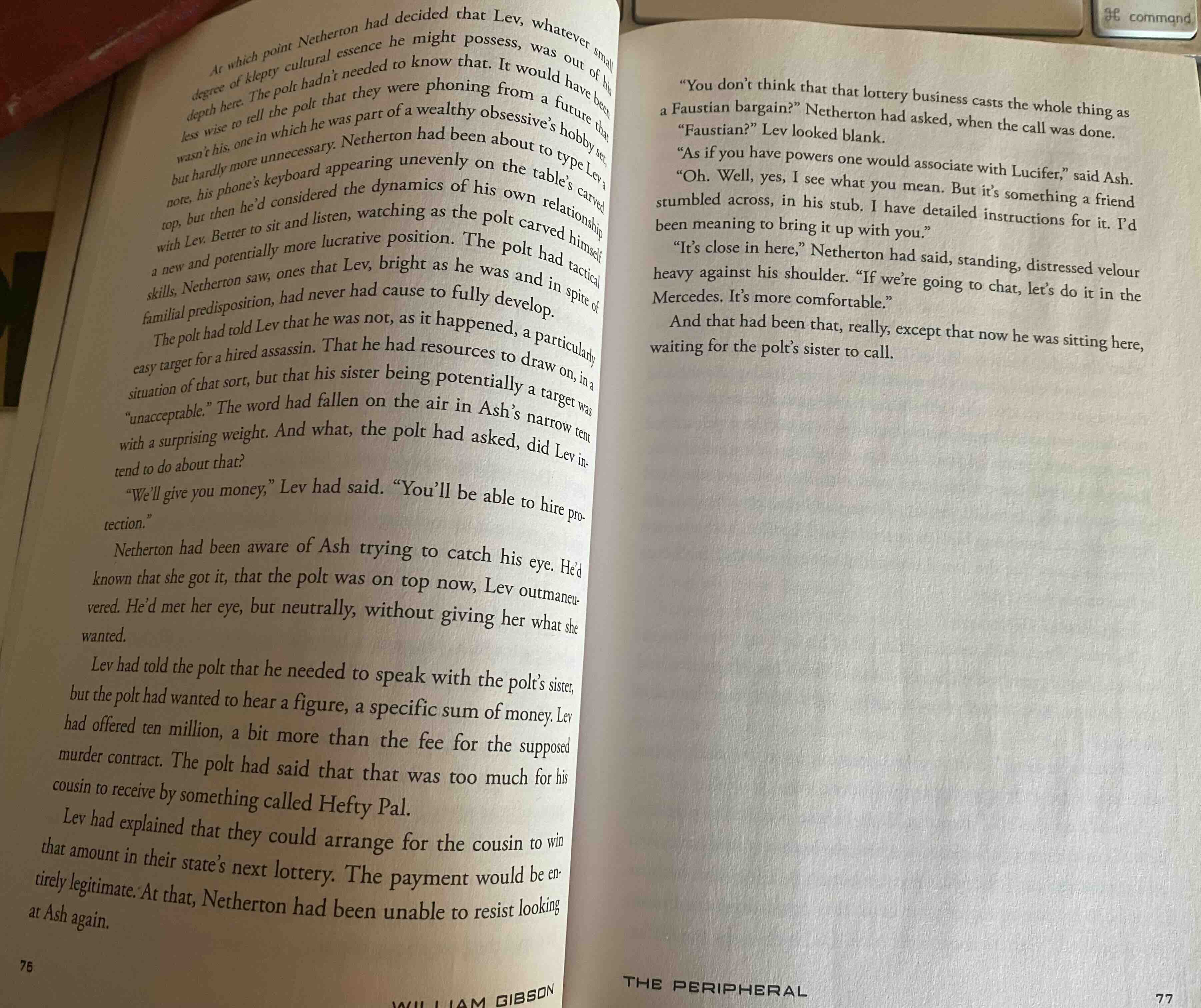 * My blogging practice is to focus arbitrarily on the page of a book that coincides with my age, currently page 77. For The Peripheral, I’ve included a little from page 76 as well.
