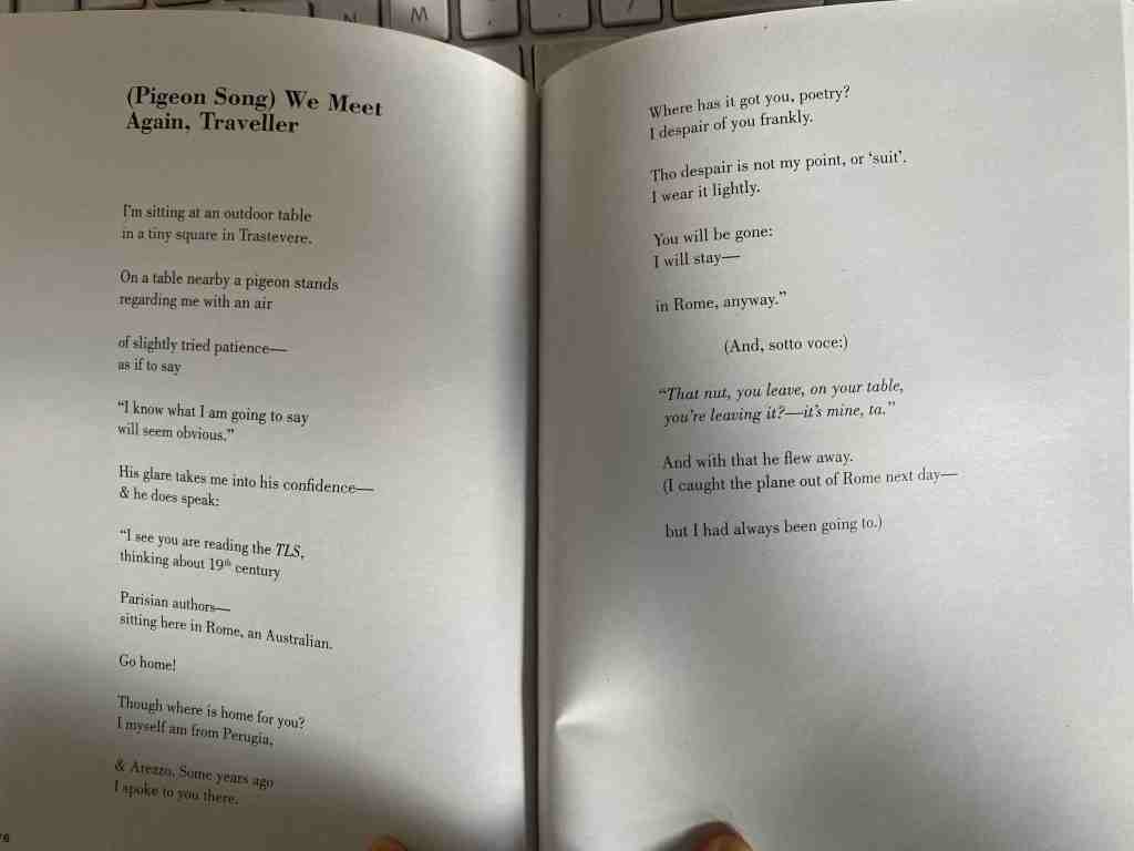 This poem might be a nice entry point for readers who are intimidated or bewildered by contemporary poetry. It’s definitely one that could have prompted the question a friend of mine asked at a Sydney Writers’ Festival session, ‘Why have modern poets given up rhyme and metre?’. The words are spread out all over the page, I imagine my friend complaining, the punctuation is mostly no help, and where are the verbs?