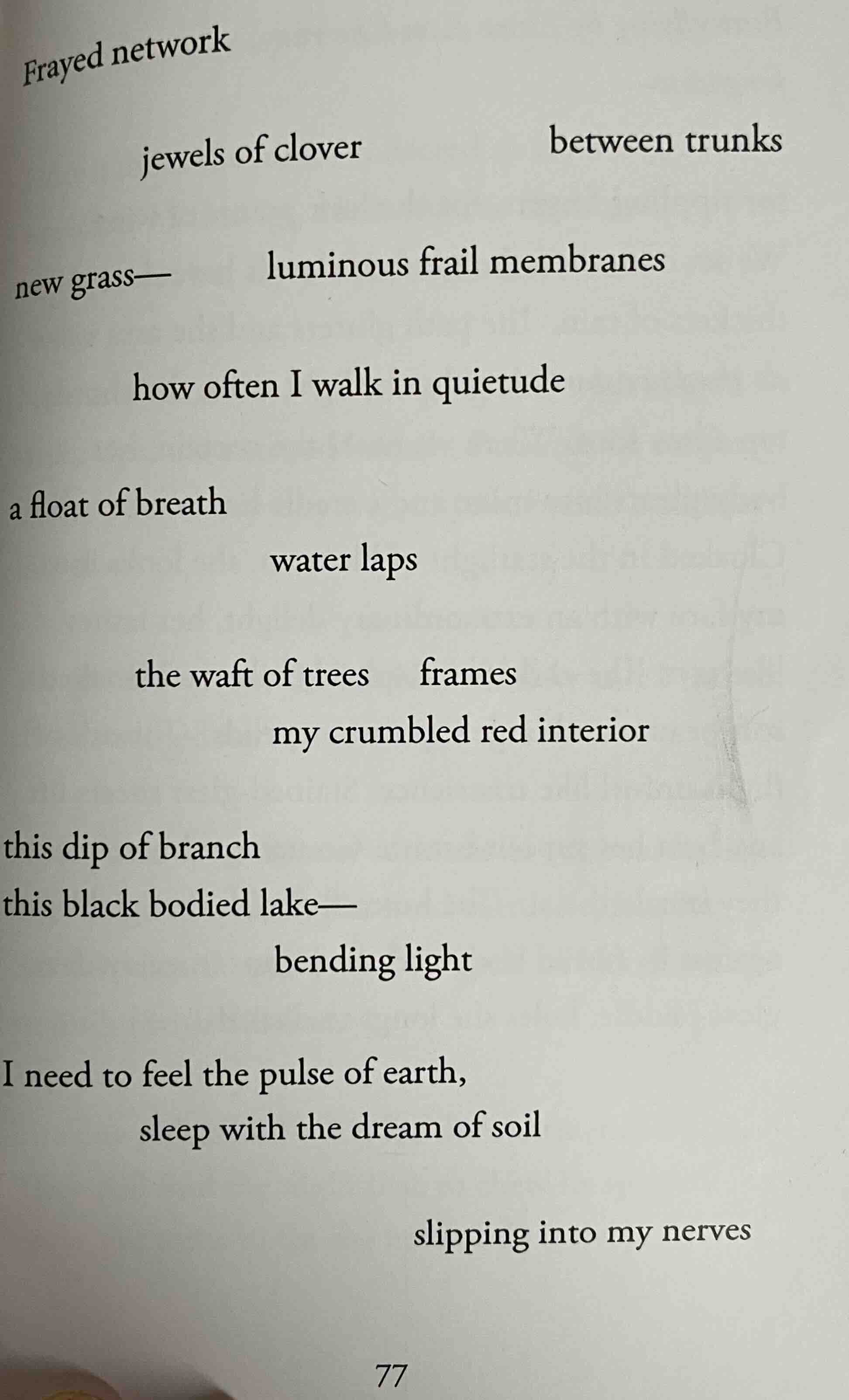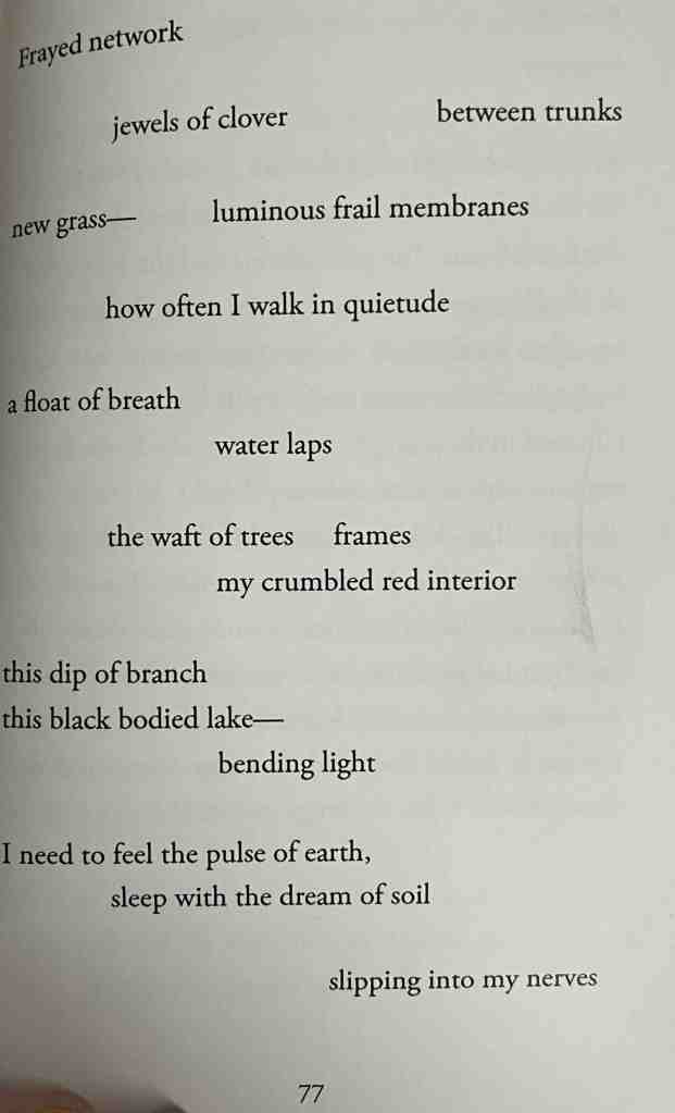 ‘Frayed network’ on Page 77* is a moment when the ominousness is mostly at bay, there is no scientific nomenclature, and attention is on the present moment in the natural world.