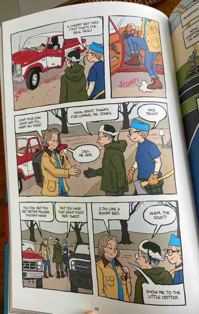Page 78* gives you an idea of the art, and the general playfulness. A couple of pages earlier Alison and Holly have been startled out of their sauna by a goat thumping about on its roof – and have stood naked in the snow, rude bits discreetly hidden. A couple of pages later their neighbours are playing at the local pickleball palace and have a zing moment when hands touch that is the beginning of the polyamory thread. Page 78 is a quiet page: no nakedness, and just a couple of flirty double entendres.