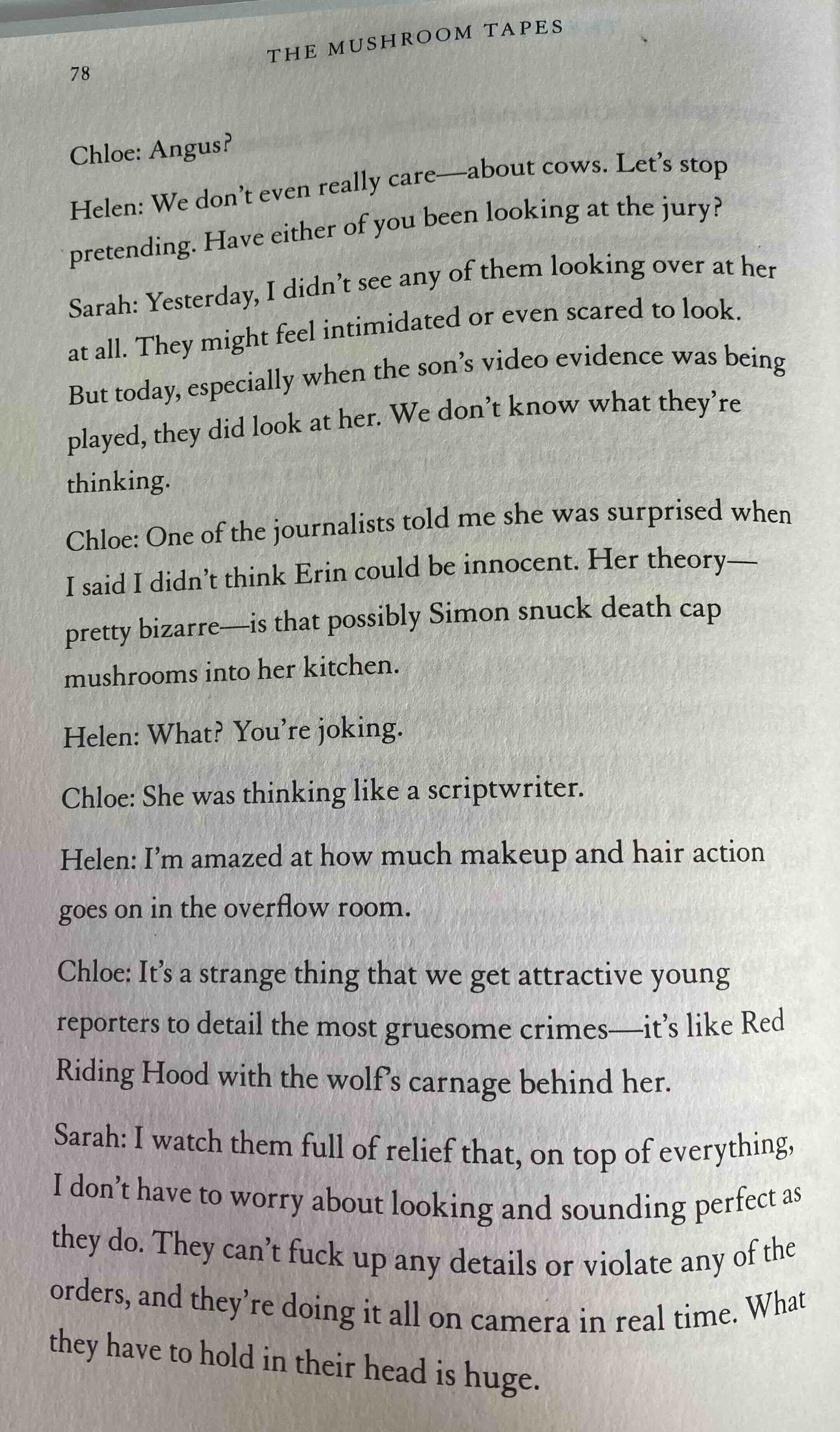 It turns out the page gives a good sense of the flavour of the conversations generally. There’s not a lot of rambling. Having raised the subject of the cows, Helen abruptly shuts it down: ‘We don’t even really care – about cows!’ And they’re away trading insights and observations – about the jury, and for most of this page about the journalists following the case.