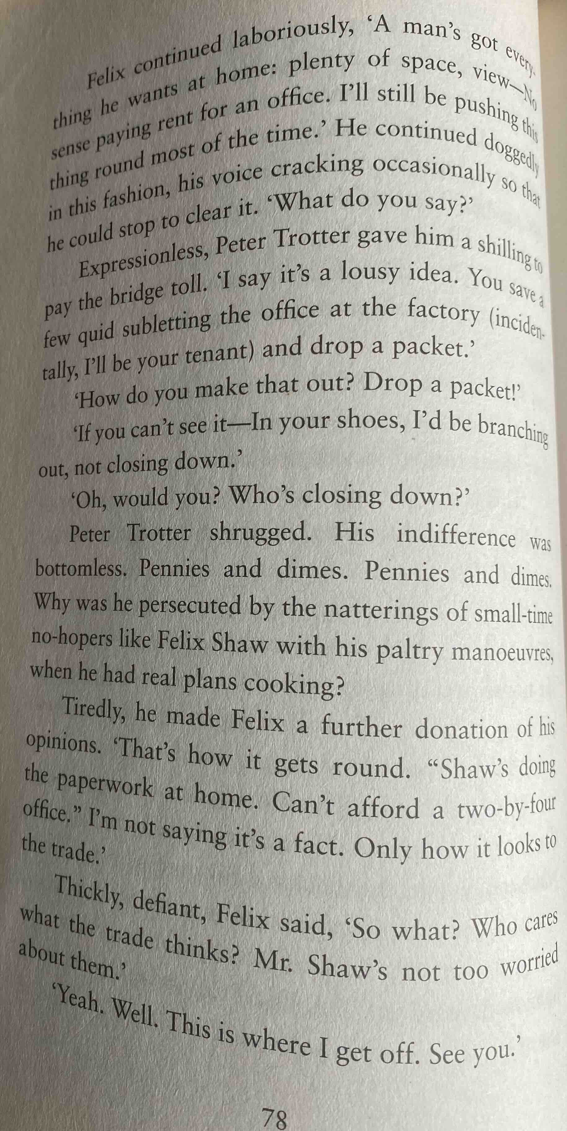 Peter Trotter shrugged. His indifference was bottomless. Pennies and dimes. Pennies and dimes. Why was he persecuted by the natterings of small-time no-hopers like Felix Shaw with his paltry manoeuvres, when he had real plans cooking?