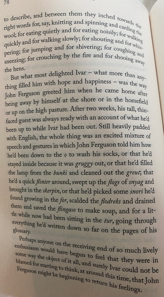 I so appreciate Carys Davies’ good judgement in not giving us footnotes. They are absolutely not necessary – we are allowed to have a faint taste of learning the language by immersion. An interested reader, as I definitely am, can turn to the Author’s Note to find that, unsurprisingly, Ivar’s language is not Carys Davies’ invention. It is a version of Norn, now extinct but once spoken on the islands of Orkney and Shetland – and on Ivar’s fictional island which lies further north than either of those. The Author’s Note includes a glossary, including all the words in italics/purple on page 78 – flodreks, for example, are ‘limpets’ and flingaso is ‘water in which limpets have been scalded’.