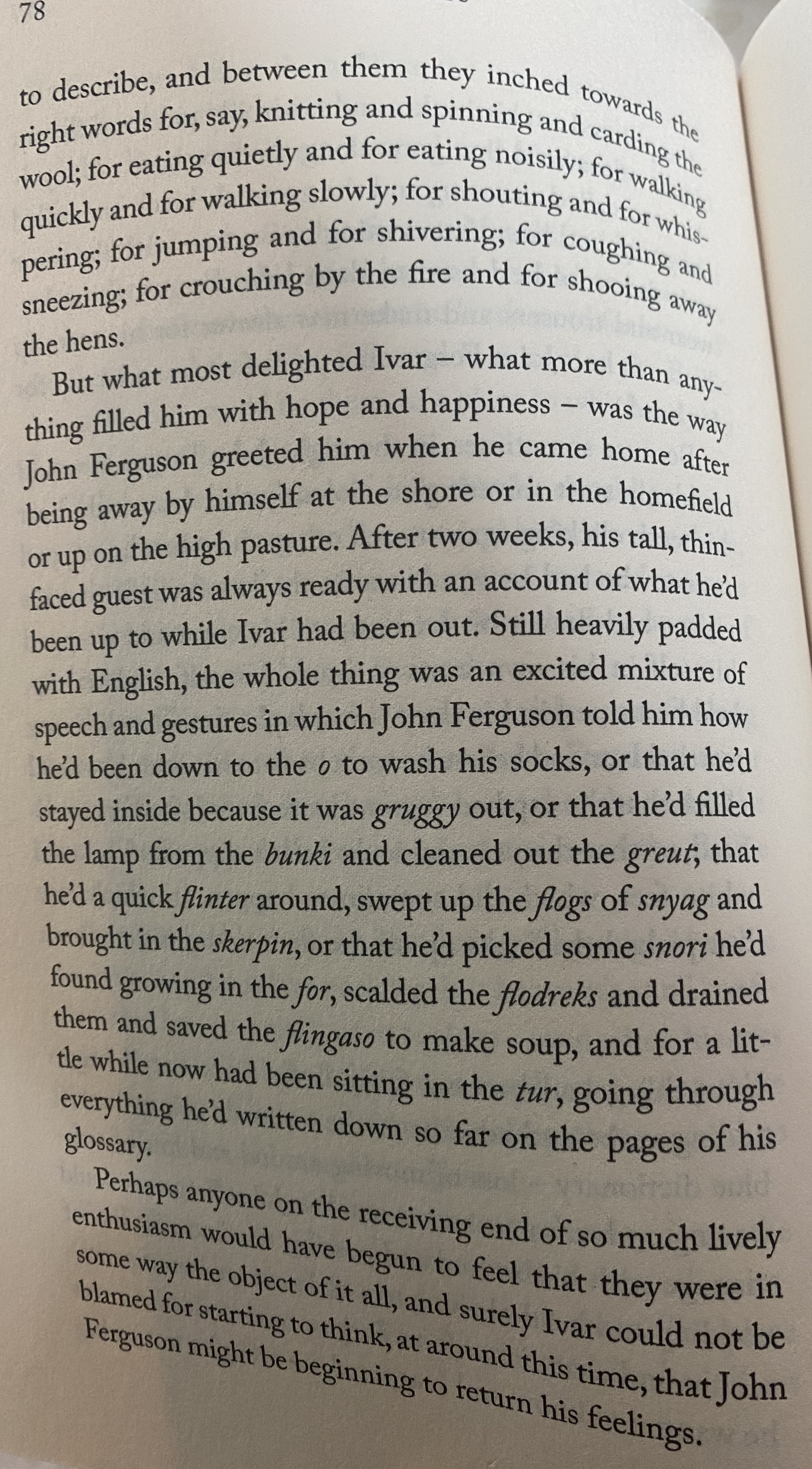 Still heavily padded with English, the whole thing was an excited mixture of speech and gestures in which John Ferguson told him how he’d been down to the o to wash his socks, or that he’d stayed inside because it was gruggy out, or that he’d filled the lamp from the bunki and cleaned out the greut; that he’d a quick flinter around, swept up the flogs of snyag and brought in the skerpin, or that he’d picked some snori he’d found growing in the for, scalded the flodreks and drained them and saved the flingaso to make soup, and for a little while now had been sitting in the tur, going through everything he’d written down so far on the pages of his glossary.