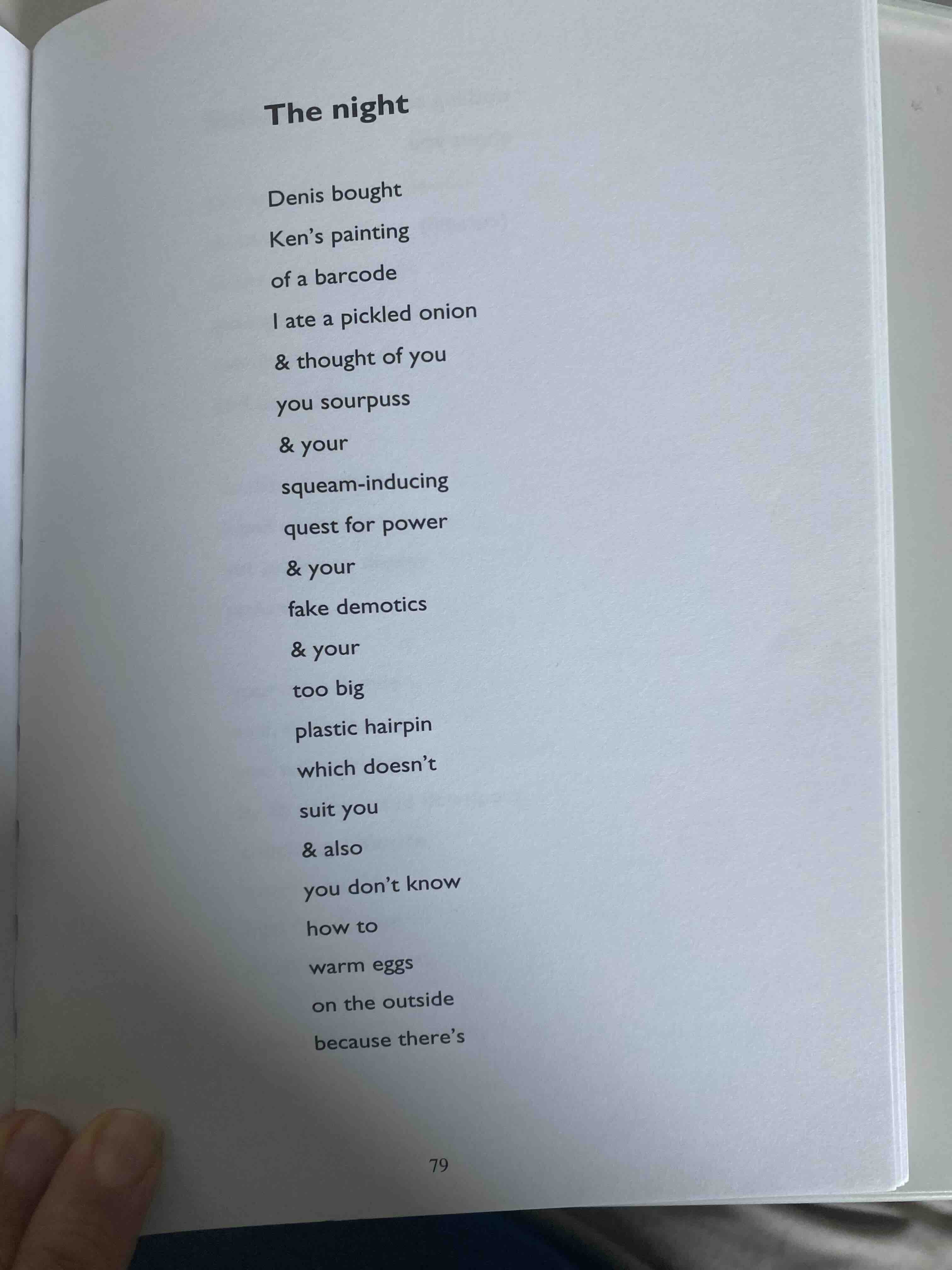 Learned people refer to Pam Brown’s gift for sprezzatura, a casual appearance that conceals the work that went into it. The veering off in the next line – the fifth to start with an ampersand – is a nice example. I can’t read the opening ‘& also’ without thinking of an angry teenager. Brown’s world of allusion is almost certainly more sophisticated than mine – but I think of Mary-Anne Fahy’s gum-chewing Kylie Mole from the 1990s. (Come to think of it, this book was published in 2002, so Kylie Mole may well have been in Brown’s mind.) So it feels like an easy, natural follow-on from the big plastic hairpin. Then, as if it’s a perfectly natural next step, the poem turns into an intimate attack: