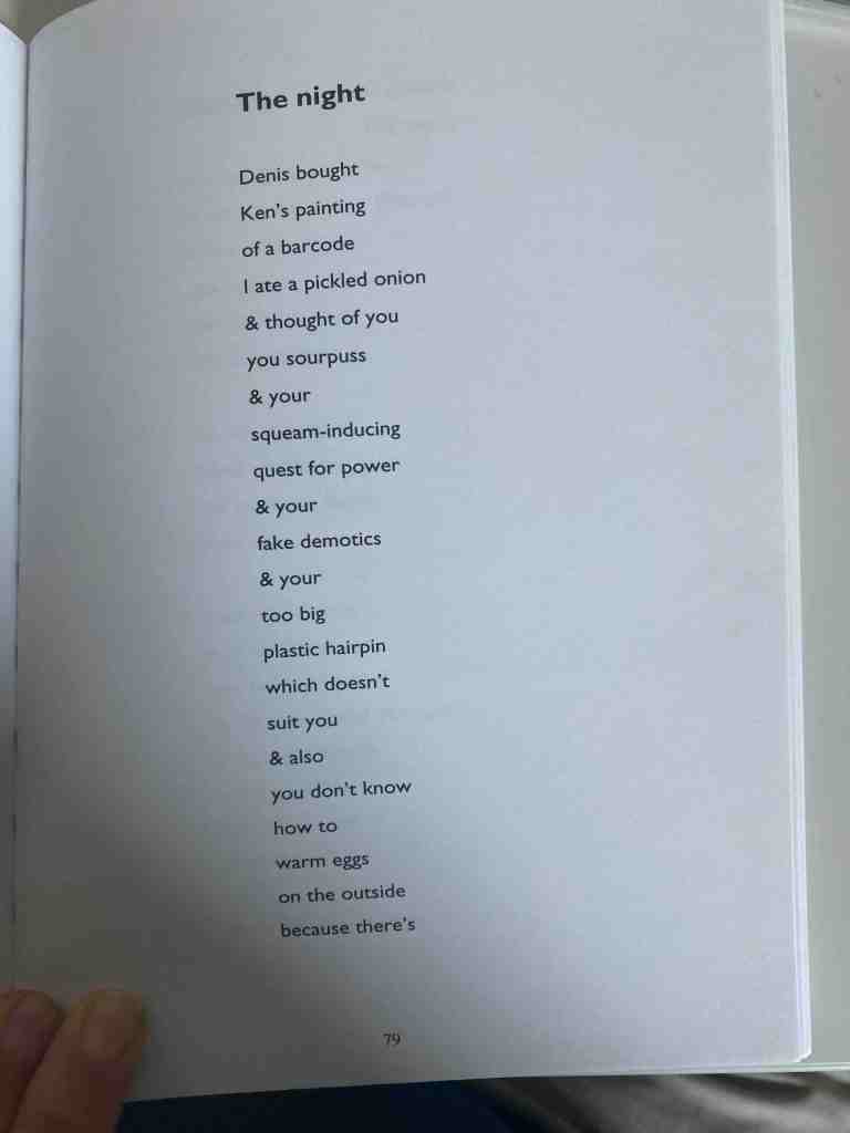 This opening clause sets the scene. I imagine the opening night of an art exhibition in a small gallery. Art is on sale and there are snacks, including pickled onions. ‘Ken’ is almost certainly Ken Bolton, poet and painter, named on the imprint page as the publisher of this book. ‘Denis’ is probably a real person too, but his identity doesn’t matter, any more than that of the poem’s ‘you’ does. What does matter is that all four people in the poem – ‘I’, ‘you’, Ken and Denis – are on first-name terms, and seem to belong to some kind of creative community – perhaps Brown’s ‘black market of culture’. Only when I read the poem out loud (to the long-suffering Emerging Artist) did I realise that there’s a lovely contrast between the briefly mentioned masculine, transactional world of buying and selling where even the artwork is an emblem of commerce, and the feminine, relational world of the rest of the poem.