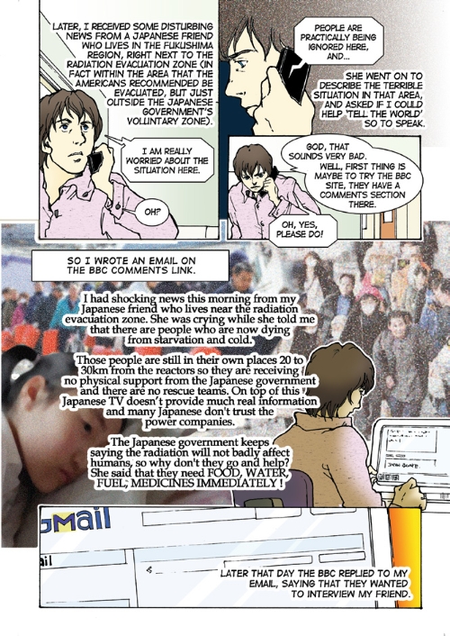Perhaps the most interesting items are those that deal with the March earthquake, tsunami and nuclear threat. Jake Adelstein’s ‘The First Responders‘ is a fascinating account of the role the yakuza played in the immediate aftermath of the disaster, and the history behind their surprising (to me) civic responsibility. While government agencies were locked in bureaucratic straitjackets the criminal organisations moved swiftly and efficiently to bring aid and maintain order in shelters where there were reports of violence and sexual assault (a yakuza organisation sent 960 ‘peace-keeping’ members across the nation, while the National Police Agency managed 30 officers). Masaru Tamamoto analyses the government’s failure to respond flexibly and effectively in ‘Conformity, Deference, Risk Aversion: Parsing Japan’s CDR Complex)’. In ‘Reaction to Disaster‘, a manga-like comic by Sean Michael Wilson and Michiru Morikawa, a British resident of Southern Japan tells his story.