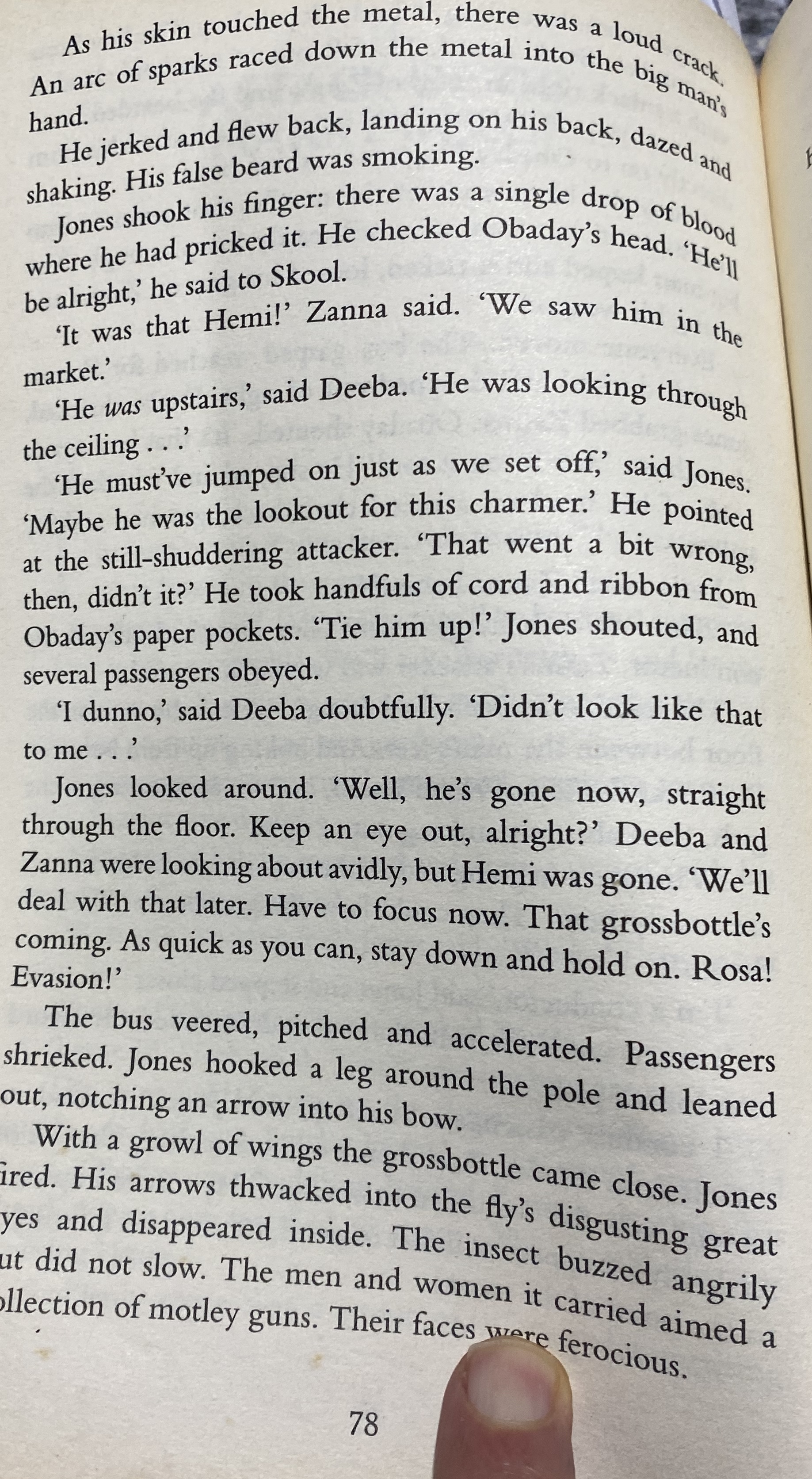 Hemi is a boy who approached our heroines when they first arrived in UnLondon. He seemed friendly, but they were warned that he was a ghost boy who wanted to steal their bodies. This, is turns out much later, was only partly true. But they fled from him and now they realise that he has followed them onto the flying bus, and has somehow passed down through the ceiling of the lower deck and then out through the floor. Hemi is an ambiguious figure at this stage of the story – as Deeba’s doubts about Jones’s narrative remind us.