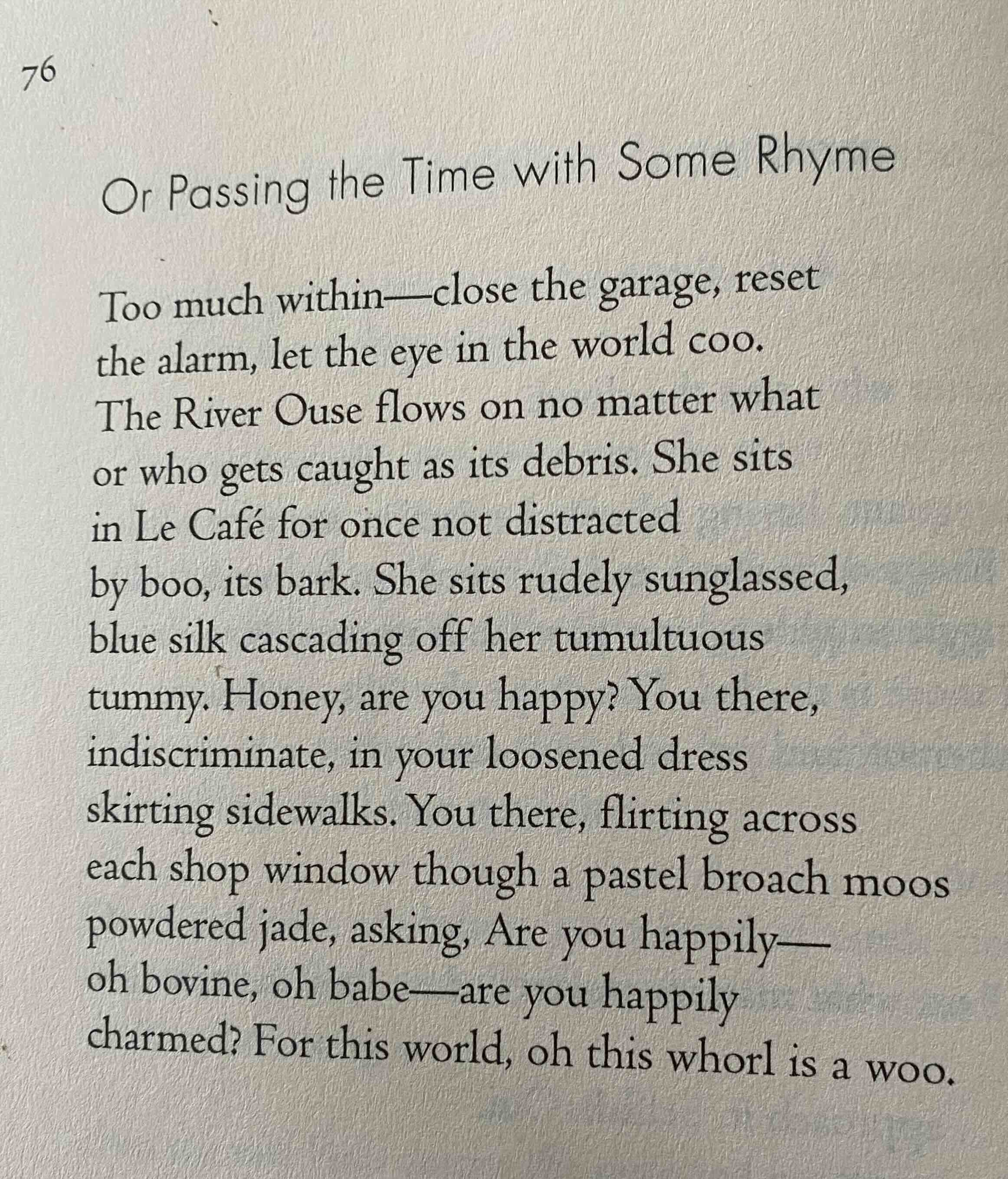 This poem is something of a turning point in the book, as signalled by the ‘Or’ in its title (not ‘On’ as a careless reading might see). We can keep going as we have been, the title says, or we can take a different route. Let’s loosen up and just pass the time. Instead of more of the serious, introspective prose poems, let’s have some fun with rhyme.