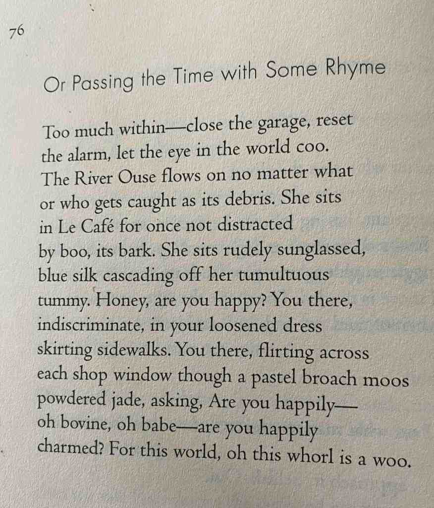 When I do that, something wonderful happens. The sound patterning, especially the internal rhyming, is at the heart of how the poem works. Just look at all those oo words: Too, coo, Ouse, who, boo, rudely, blue, you (several times), loosened, moos, woo. There’s more to the soundscape than this (‘tumultuous tummy’, for example, and heaps of alliteration in the sestet), but once you’re alert to how the poem sounds, those odd words – coo, boo, moo and woo – make sense. It’s easy enough to find a paraphrasable meaning for them: ‘let the eye in the world coo’ equals ‘let the world look on you with the indulgence of a lover who bills and coos’; ‘not distracted / by boo, its bark’ equals ‘not having one’s attention dominated by this thing that is scary like a ghost or a savage dog’; ‘this world is a woo’ equals ‘this world is waiting to be loved by you, is wooing you’. It almost feels as if the notion of bovineness is introduced so the brooch (I think ‘broach’ must be a typo) in the shop window could moo. The literal meaning matters, but maybe what matters even mnore is the way the words just sing on the page. The final phrase, ‘oh this world is a woo’, becomes a fabulous, semi-nonsensical affirmation of life as joyful.