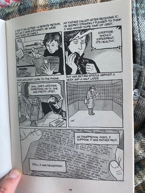 If you enlarge this image you see how beautifully words and images are integrated. The captions offer a commentary on the action: ‘We were that sort of family,’ ‘He seemed strangely pleased,’ ‘I was devastated’. The page is a good example of Bechdel’s skill with dialogue: the father’s words on the phone convey his awkwardness quite independently of the caption’s commentary. The images are more than illustration – the technical term for this kind of story telling is ‘sequential art’, a different beast from ‘illustrated story’. We see how 19-year-old Alison lives: her clothes, the music she listens to, that she has to go to a post office box to receive mail, that her coming-out letter is typed, and composed with the assistance of a thesaurus. As often in this book, the images themselves include text: not just the names of books and records, but a glimpse of the mother’s letter, implying a documentary dimension to the narrative.