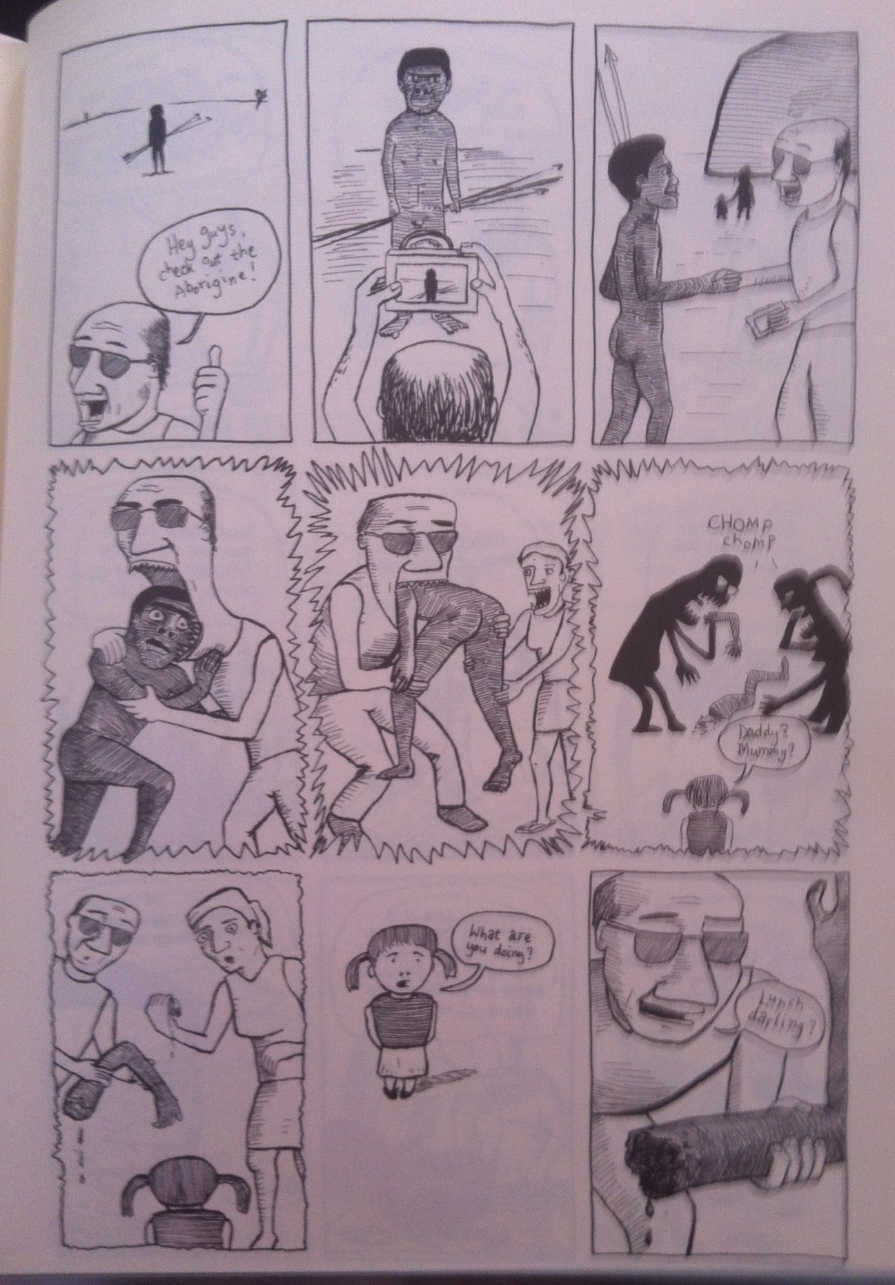 At the heart of the book is a search for something beyond individual aberration to account for so-called mental illnesses such as psychosis, substance abuse, violence and depression among Central Australian Aboriginal people. In crude, non-psychological terms, there’s a plain enough answer: they have largely been dispossessed and are on the receiving end of continuing dispossession – San Roque calls this cannibalism, which leads to one of Santospirito’s most compelling pages (especially the last two frames):