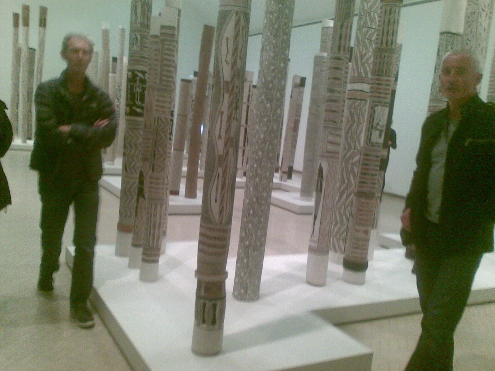 There’s far too much in this exhibition for one visit, or one blog entry. I was struck by the amount of Indigenous art – from Australia, of course, but also from New Guinea, the Arctic, the Americas and Europe. One large room on the top floor is devoted to 110 larrakitj (memorial poles) by 41 Yolngu artists from East Arnhem Land, and it’s a knockout. There’s brilliant trompe l’oeil, wonderful sculptural play, images reminiscent of the Mexican Día de los Muertos, shimmer to make your eyes water. A place to just stand and stare. I took my one phone photo there. It might give you some idea.