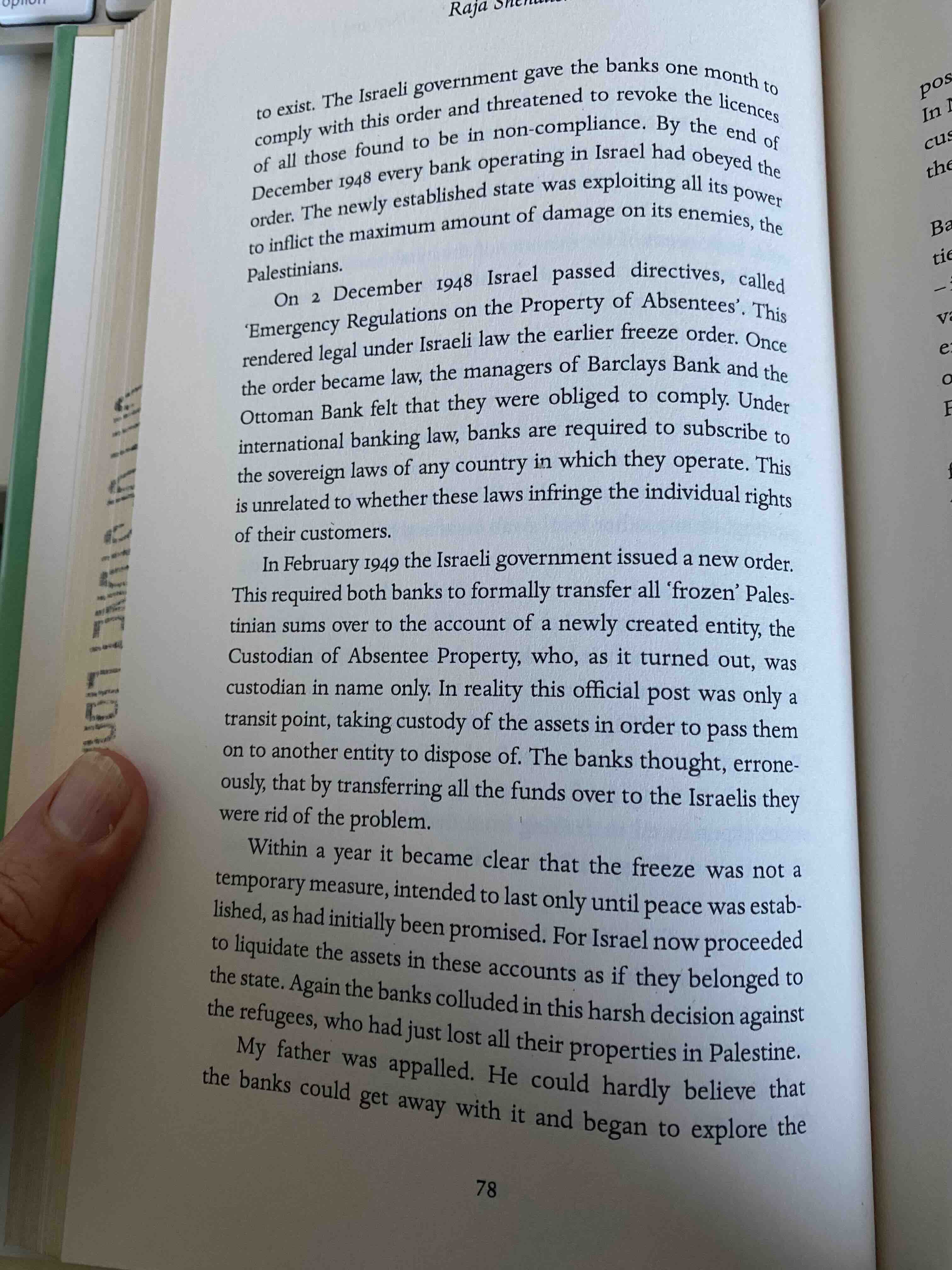 On this page, in measured, objective prose, Shehadeh outlines the ruthlessness of the new Israeli government. First, in December 1948, there were directives called Emergency Regulations on the Property of Absentees, with which both active banks, one British and the other Arab, felt obliged to comply. In February 1949 the Israeli government required the banks to transfer the affected funds to a new entity called the Custodian of Absentee Property. The banks could wipe their hands of the issue.