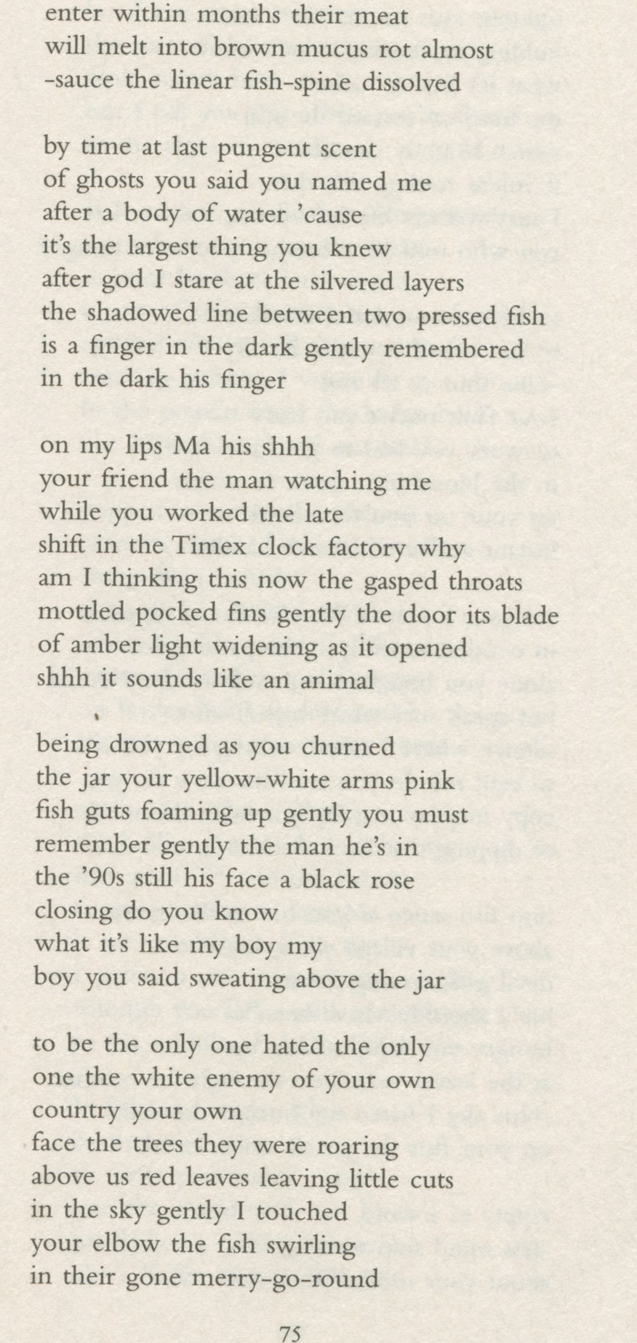For context, it’s a long poem, 33 eight-line stanzas, framed (like On Earth We’re Briefly Gorgeous) as an address to the poet’s mother. It recalls key moments from her life: a schoolhouse destroyed by napalm when she was six years old; her ostracism in Vietnam as the son of a white US soldier; her brother shot dead for stealing a chicken to feed her. Intermingled with these historical moments are some apparently random elements: the sight of an ant carrying its dead brother; memories of his mother making fish sauce from the salted corpses of ‘a garbage bag of anchovies’. Page 75 goes from mid-stanza 17 to stanza 21. In the image below, disregard the first word, a carry over from the previous line. It may help to know that ‘their’ in the first line refers to the fermenting anchovies: