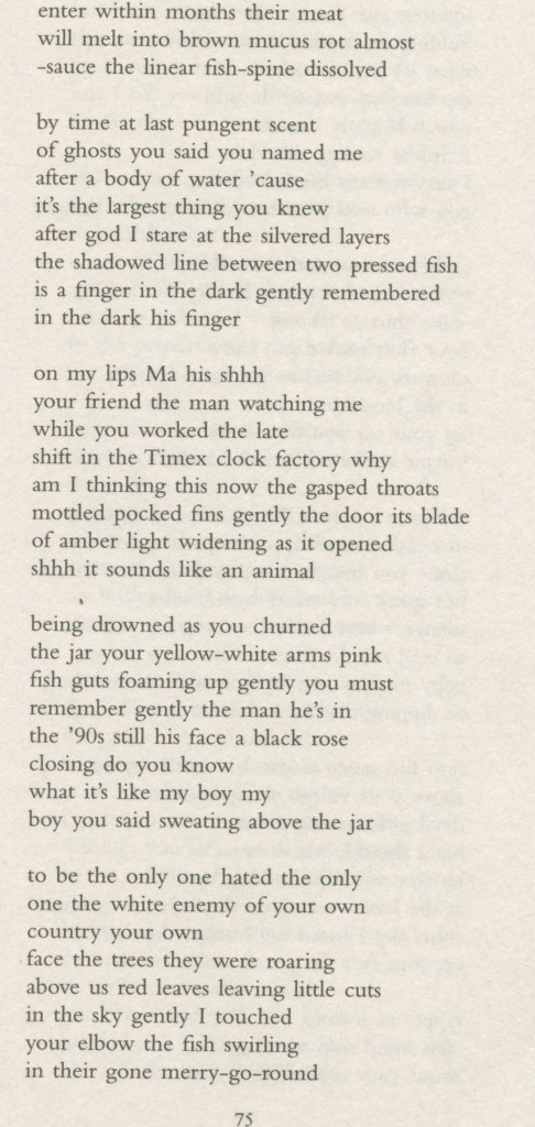 As usual, I want to look at some of the poetry in close-up. I’ve picked page 75 arbitrarily (it’s my age – at least it was when I started this blog post), but it happens to fall part way through ‘Dear Rose’, the most powerful and interesting poem in the collection. You can read the whole poem at this link, with an elegant introduction by Ben Lerner.