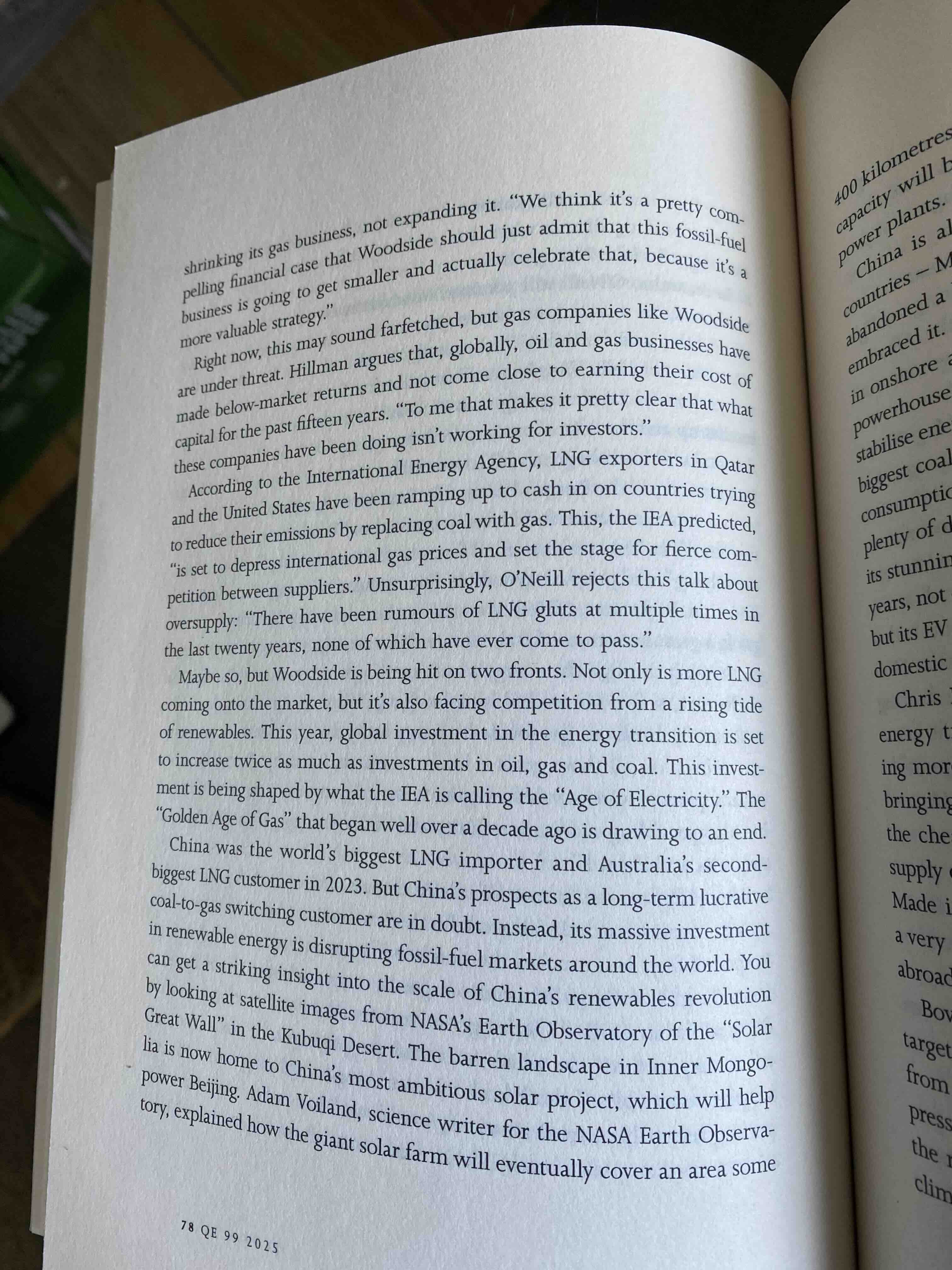 Page 78* is in the eighth and final section of the essay. Earlier sections have dealt with Meg O’Neill’s career, the growth of Woodside, the way Woodside has come to have such tremendous influence on government policy, the disruptors, the struggle over the petroglyphs, and the vision of ‘gas-fired futures’ shared by Woodside and governments. This final section – ‘Woodside in the Age of Accountability’ – introduces an element of hope, and urgency. It lists the tangible results of global warming so far, and quotes eminent scientists as saying that ‘the next three years will be crucial in stopping this seemingly inexorable rising of emissions’. On page 78, the full absurdity of Woodside’s favoured activities come to light:
