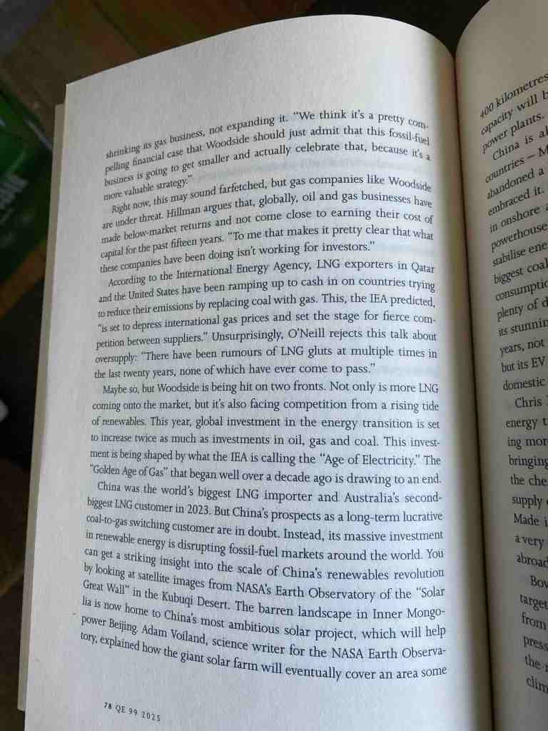 Marian Wilkinson is a journalist, not an advocate. But she is not in thrall to that concept of balance where you present any situation as a debate between two points of view, with no fact-checking or conclusion. Among the many people she interviewed for the essay is Meg O’Neill, CEO of Woodside, whom she quotes as saying that gas produces less greenhouse effect than coal, and that some gas is necessary as the world transitions to renewable sources of energy. But she doesn’t leave that as one equal side of an argument for and against. What emerges is an understanding that yes, gas will play a role in the transition to renewables, but Woodside and its supporters (or possibly dupes) in government and the media massively overstate how much gas will be needed. The profit motive overrides any concern for the common good.