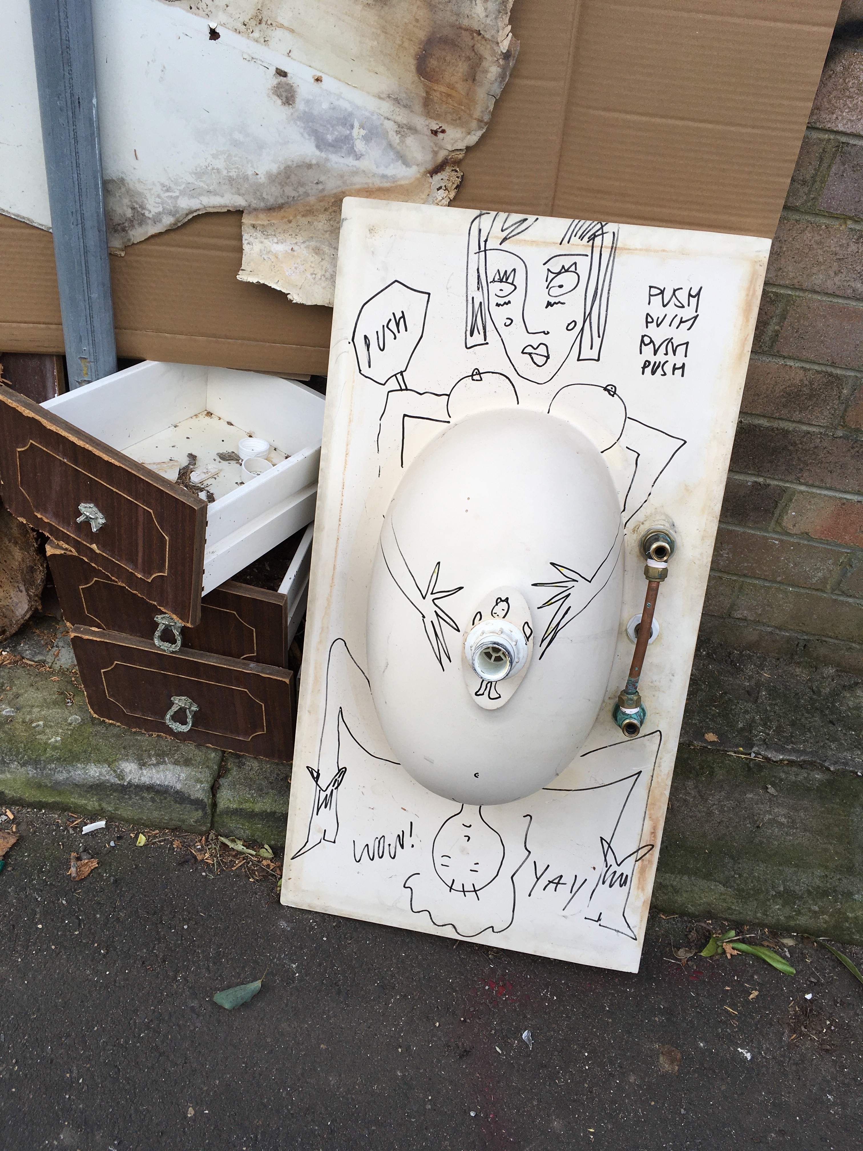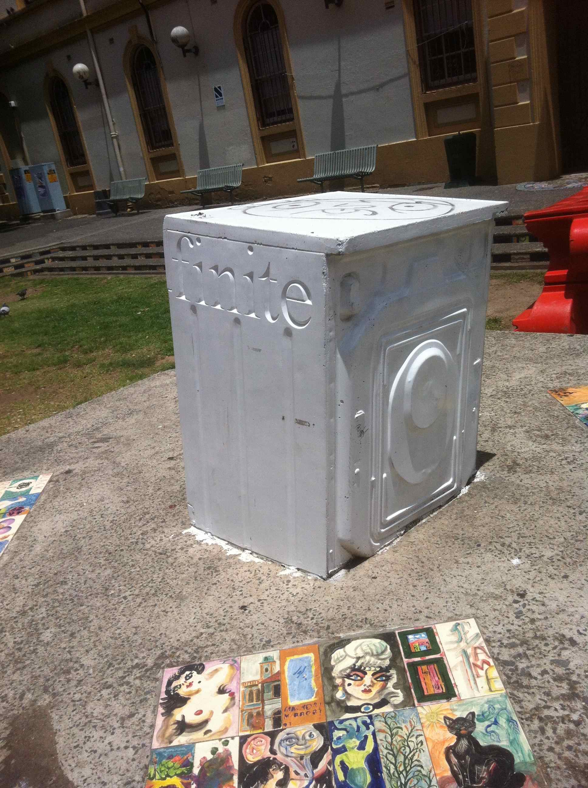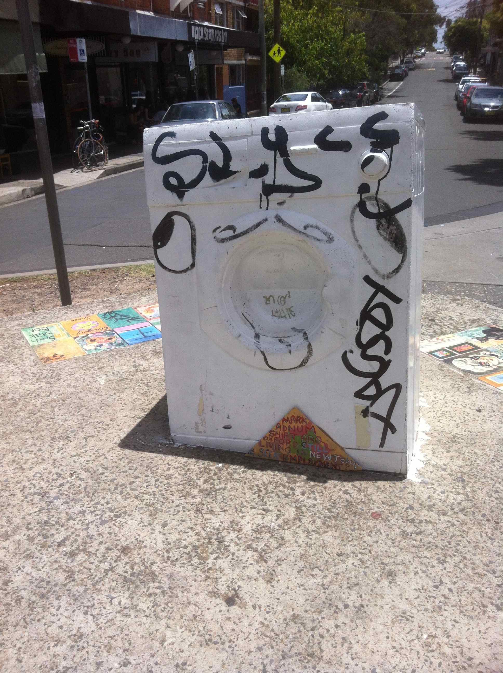 But here it is from the other side. Not just the graffitists, but another street artist with a distinctive lettering style have used the sculpture as their canvas. Not so bad really: it just changes the image from white-goods consumerism to tacky laundromat.