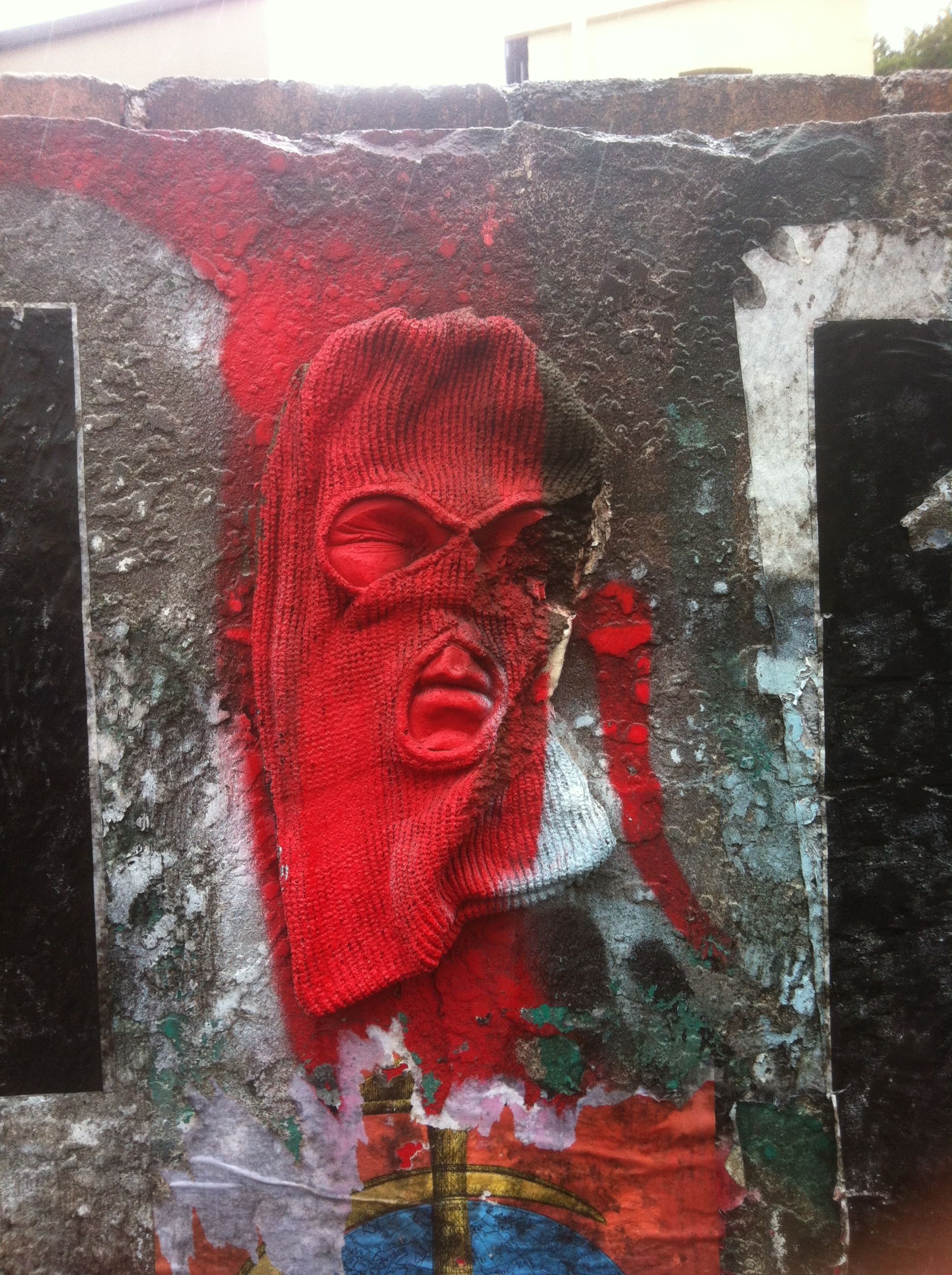 Voilà! The piece is entitled Laissez Faire, but its comment on larcenous capitalism is a bit lost when it has been chipped at and buried in red paint.