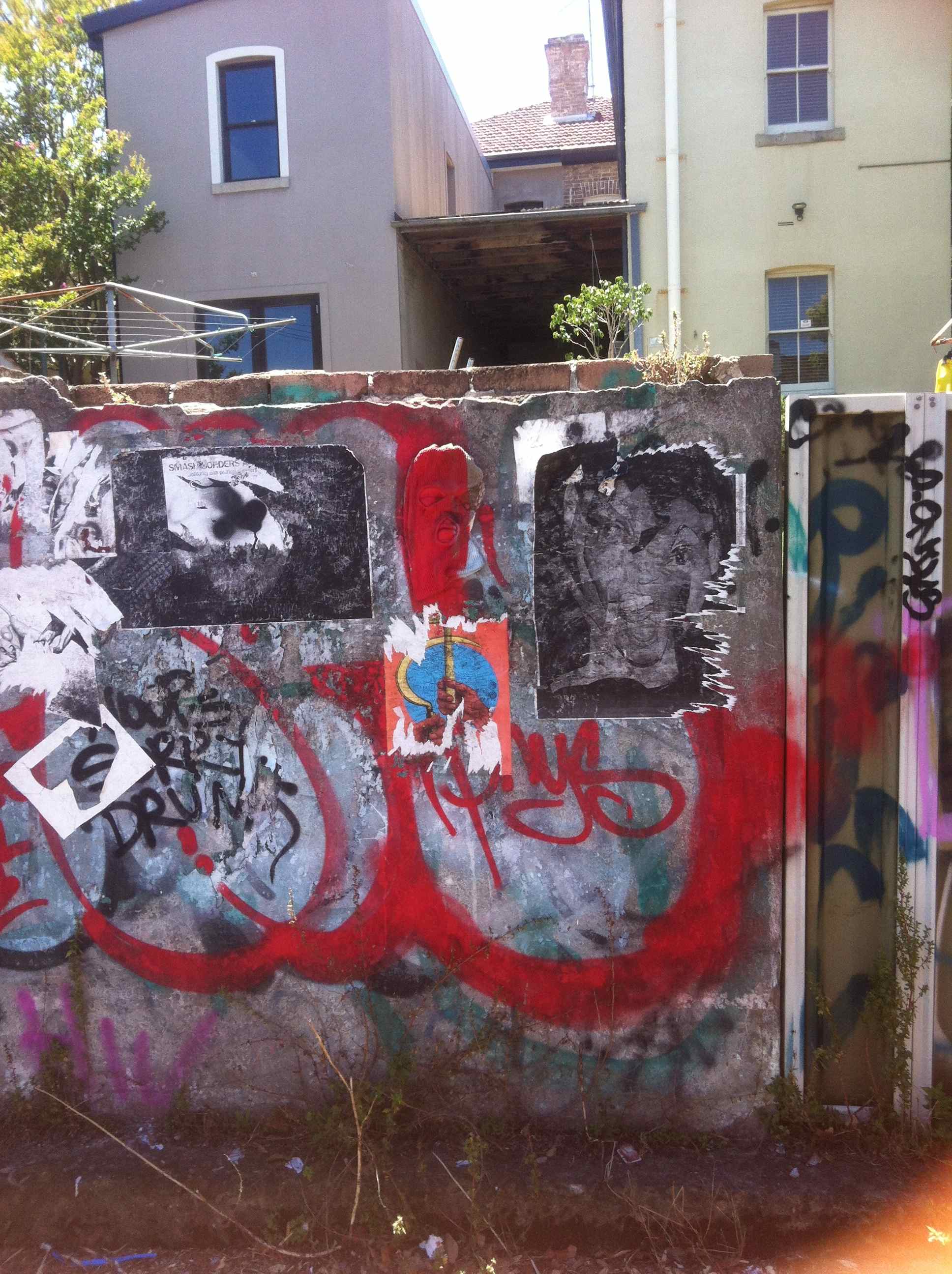 Here’s a patch of wall just off Enmore Road that’s been liberally covered with posters and graffiti. Hidden beneath the layers is a Will Coles sculpture.