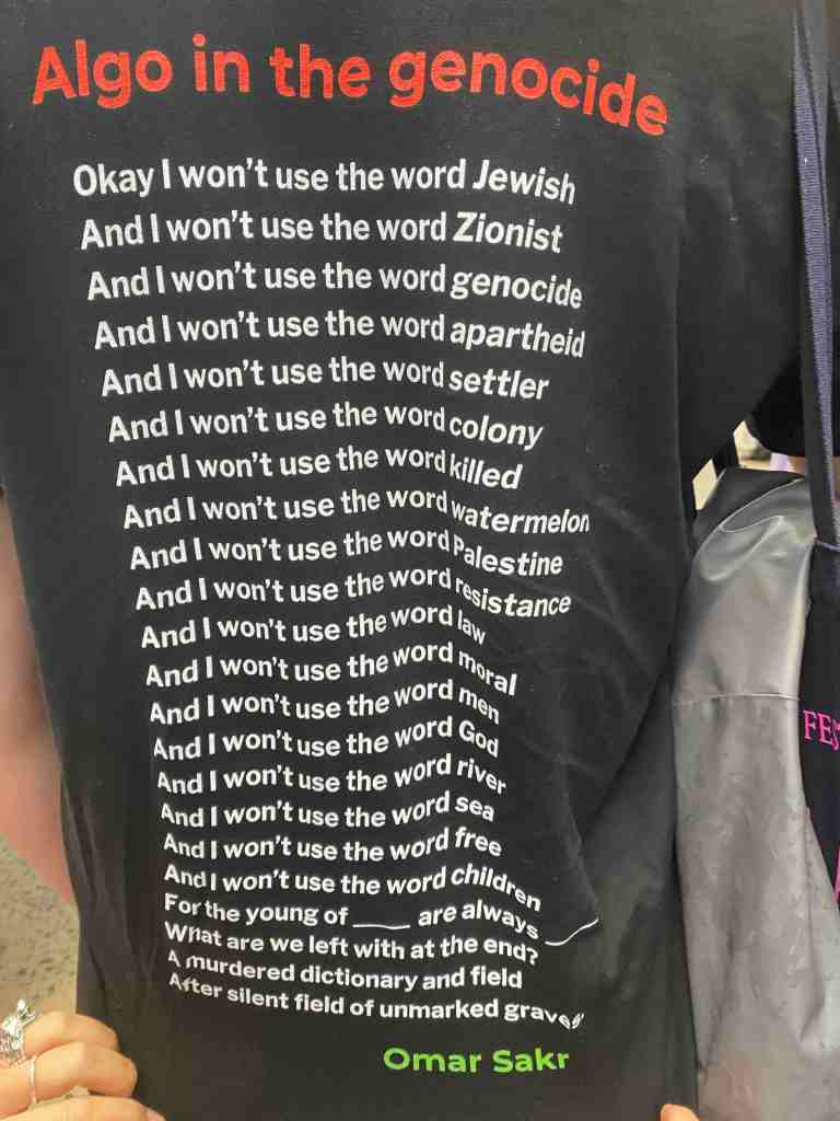 The small fraction of the Festival that I saw was terrific. At least four people, from different perspectives, spoke of the importance of countering the dehumanisation of Palestinians. There were lots of Readers against Genocide t-shirts, but any fears that there would be displays of antisemitism proved to be unfounded. There were wonderful poetry events – curated as part of the First Nations program, featuring a spectacular international guest, launching a landmark anthology of Muslim poets. I missed the intimate poetry sessions that were a feature of the Festival when it was held at the Walsh Bay wharves. Maybe next year we could have Pádraig Ó Tuama, or Judith Beveridge, or Eileen Chong, or a swag of poets from Flying Islands, Australian Poetry, or Red Room.