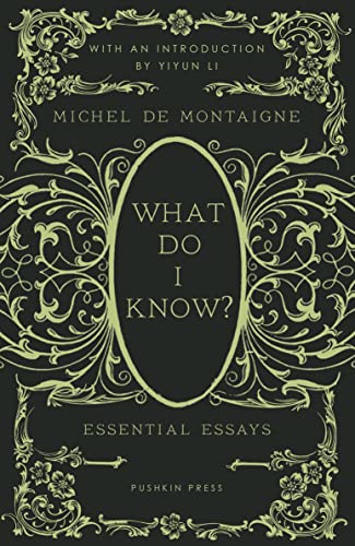 Michel de Montaigne, The Complete Essays (Penguin Classics 1991, translated by M. A. Screech) Book 1, from beginning to part way through Essay 26, ‘On educating children’ and also Essays of Michel de Montaigne — Complete, translated by Charles Cotton 1877 (Project Gutenberg, 2004) Michel de Montaigne, Essays (Penguin Classics 1959, selected and translated by J. M. Cohen) Michel de Montaigne , What Do I Know? Essential Essays (Pushkin Press 2023, selected and translated by David Coward with an introduction by Yiyun Li)